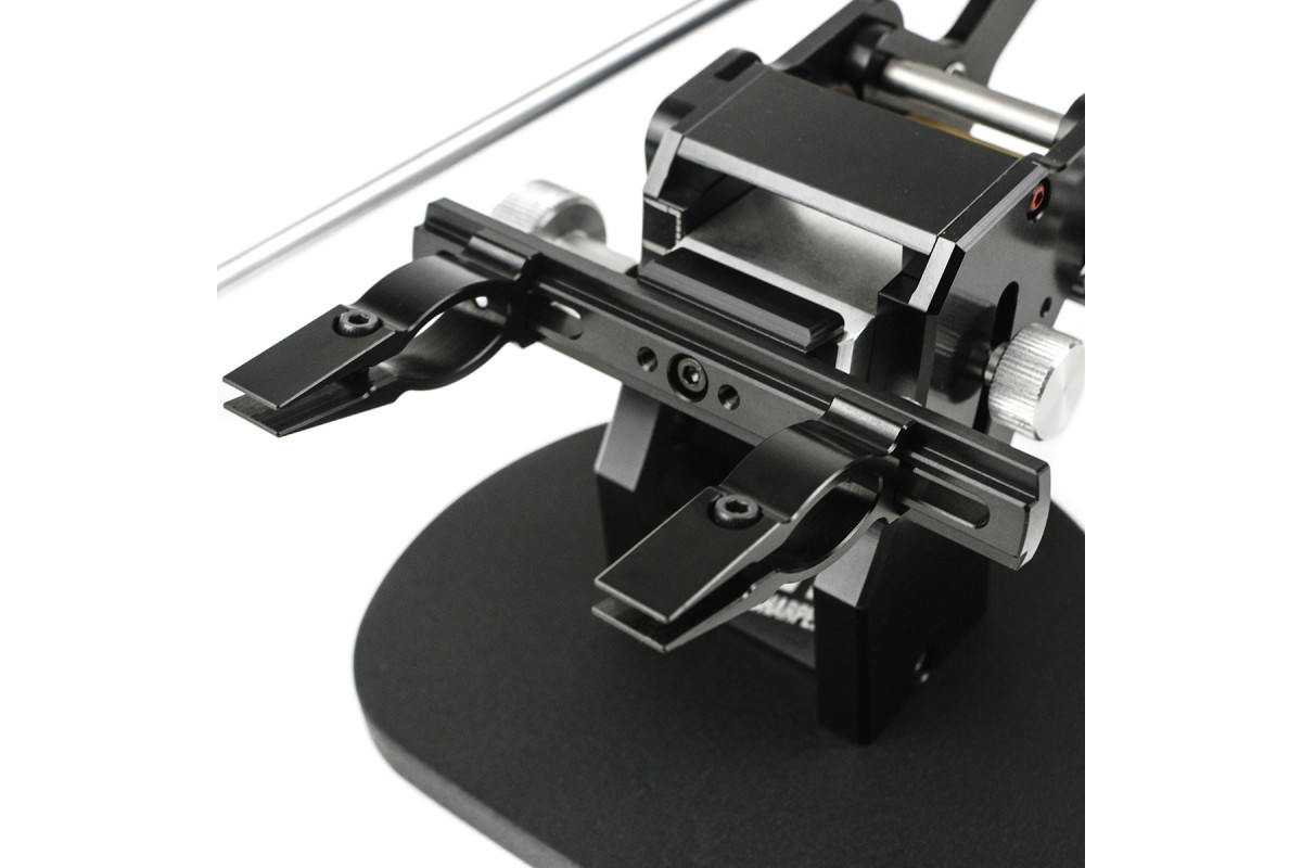 Blitz Pro комплектуется цельнофрезерованными алюминиевыми зажимами, которые выполнены из высокопрочного авиационного алюминия c анодированием черного цвета. Зажимы перемещаются по всей длине рамки одним движением и позволяют максимально точно позиционировать нож. Благодаря монолитной конструкции зажимов, они обладают повышенным сопротивлением давлению на абразив, обеспечивая тем самым постоянство углов на всех этапах работы, начиная от обдирки заканчивая финишной доводкой. Зажимы не требуют калибровки и подгонки под клинки с разной геометрией. Они дают возможность заточить кухонные ножи, складные ножи, охотничьи ножи, ножи мультитула с толщиной обуха до 4,5 мм. Длина рамки в 105 мм, позволяет затачивать нож с длиной клинка до 280 мм. Зажимы регулируются L-образным ключом 2,5 мм.