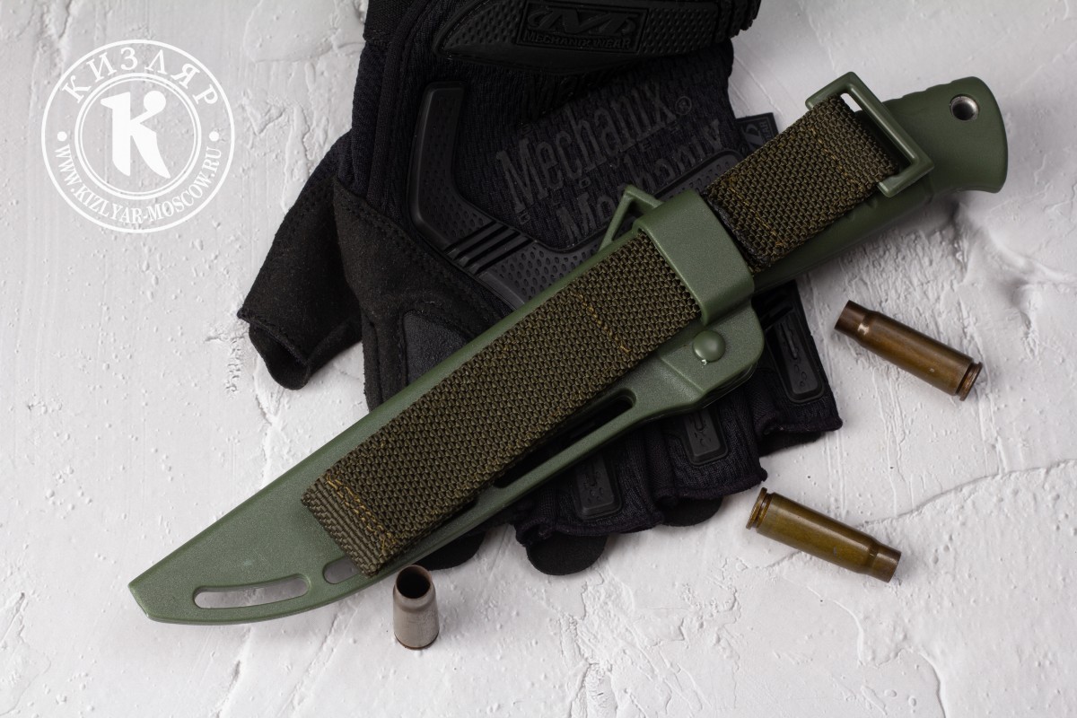 Ножны заслуживают отдельного внимания. Они выполнены из ударопрочного пластика ABC. Крепления ножа происходит с помощью ролика, расположенного в верхней части ножен. В конструкции ножен предусмотрены отверстия для их крепления с помощью дополнительного ремня не только к поясу, но и к бедру. Присутствует возможность с помощью универсального крепления (приобретается отдельно) закрепить нож на ножнах или разгрузочной системе MOLLE под любым углом. Нож фиксируется в ножнах надежно, что исключает возможность его непроизвольного выпадения. При этом сам нож можно достать в нужный момент легко и быстро. В комплект поставки входит нейлоновый ремешок для фиксации ножа на поясе.