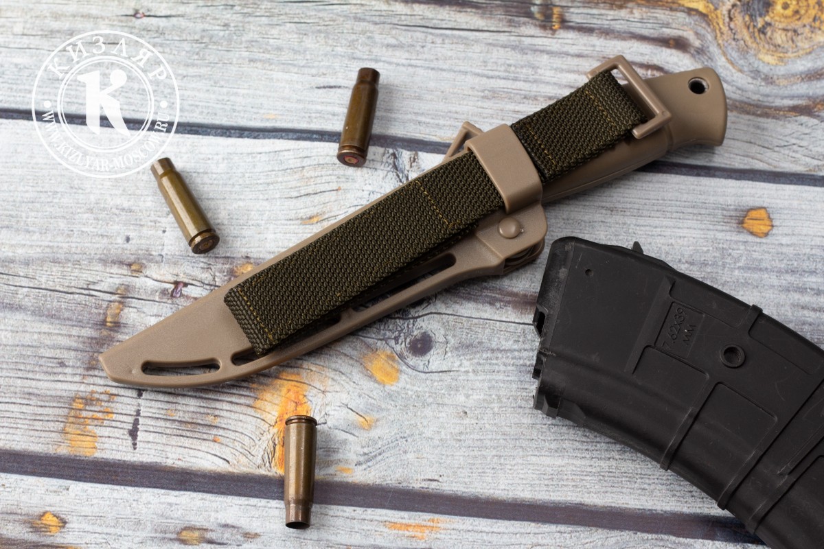 Ножны заслуживают отдельного внимания. Они выполнены из ударопрочного пластика ABC. Крепления ножа происходит с помощью ролика, расположенного в верхней части ножен. В конструкции ножен предусмотрены отверстия для их крепления с помощью дополнительного ремня не только к поясу, но и к бедру. Присутствует возможность с помощью универсального крепления (приобретается отдельно) закрепить нож на ножнах или разгрузочной системе MOLLE под любым углом. Нож фиксируется в ножнах надежно, что исключает возможность его непроизвольного выпадения. При этом сам нож можно достать в нужный момент легко и быстро. В комплект поставки входит нейлоновый ремешок для фиксации ножа на поясе.