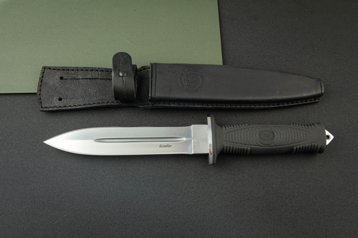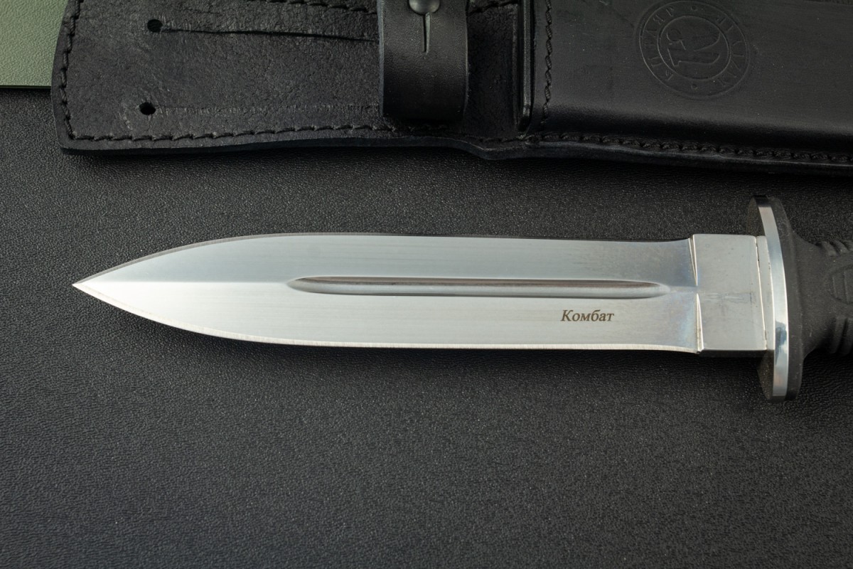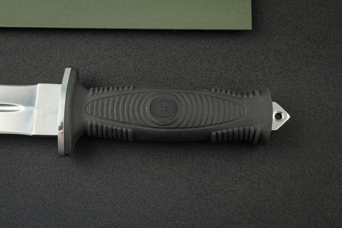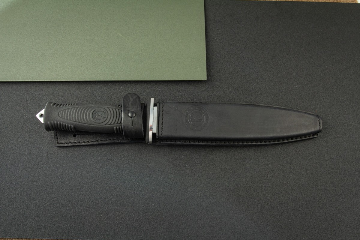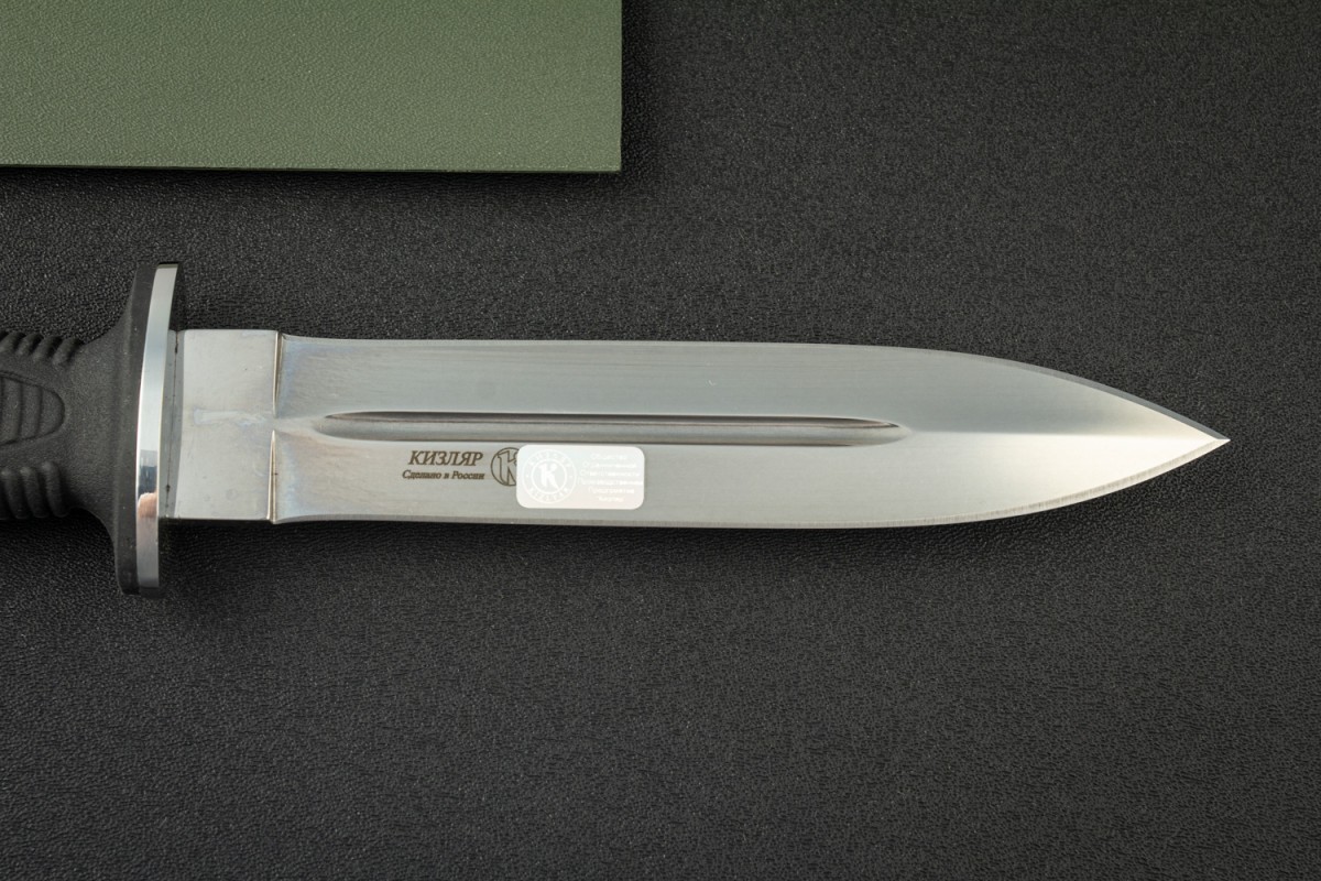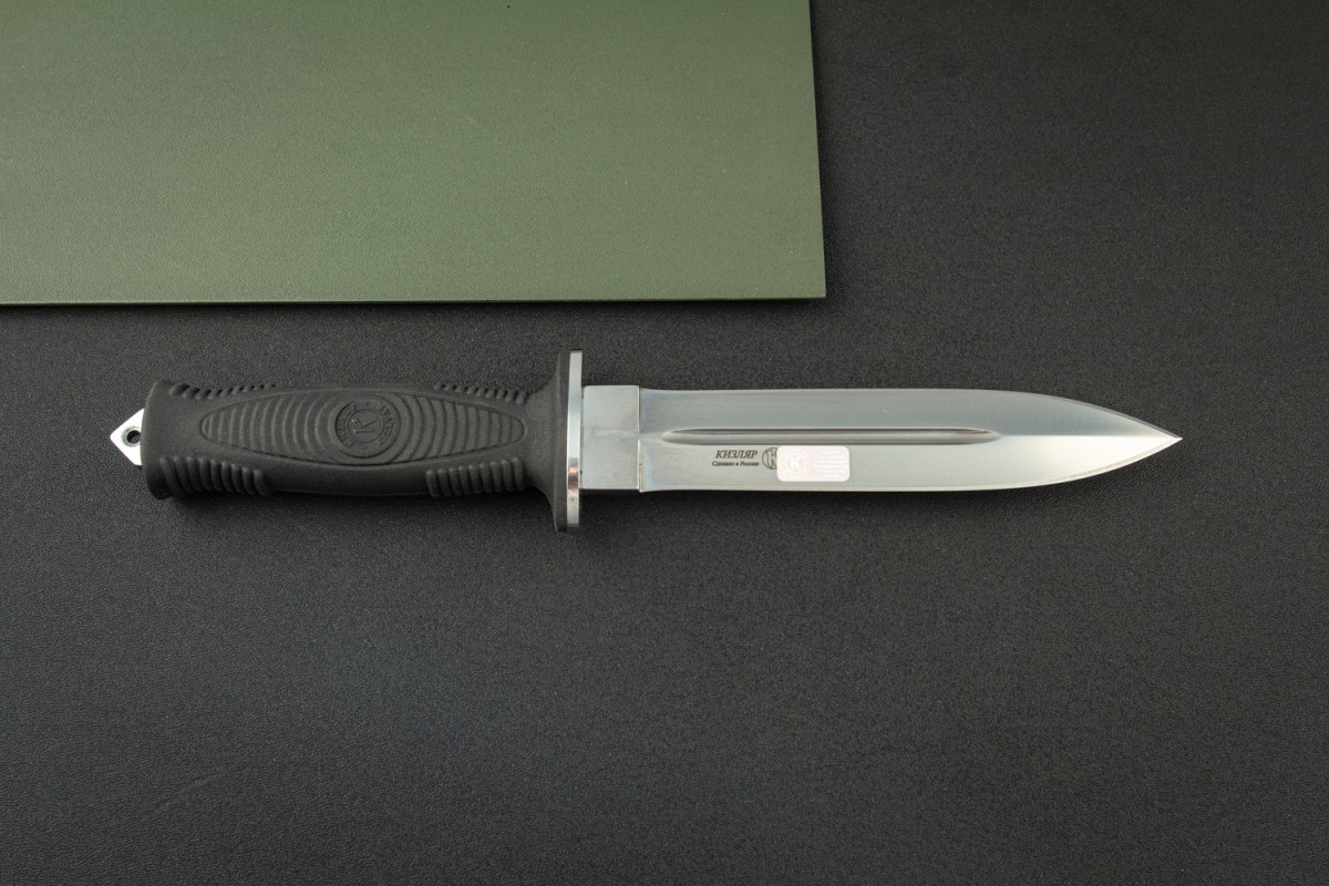 Клинок ножа выполнен из цельного куска метала. Хвостовик проходит насквозь через рукоять, образуя на конце выступ-стеклобой. Такая конструкция обеспечивает максимальную прочность при выполнении сложных задач. Клинок имеет кинжальную форму с обоюдоострой заточкой обоих сторон. Одна из сторон имеет зубчатую режущую кромку. Эта сторона клинка может выполнять функции пилы или серрейторного лезвия. Для повышения прочности клинок имеет фрезерованные долы с обеих сторон. Устойчивая к коррозии сталь закалена до 57-59 HRC. Обрезиненная рукоять ножа вместе соединения с клинком имеет защитные выступы, которые выполняют функцию гарды. Рукоять оснащена насечками, которые обеспечивают плотное удержание ножа в руке. Нож укомплектован ножнами из качественной кожи с пластиковой вставкой, при необходимости, долполнительно можно приобрести ножны из пластика в нейлоновом чехле с креплением МОЛЛЕ