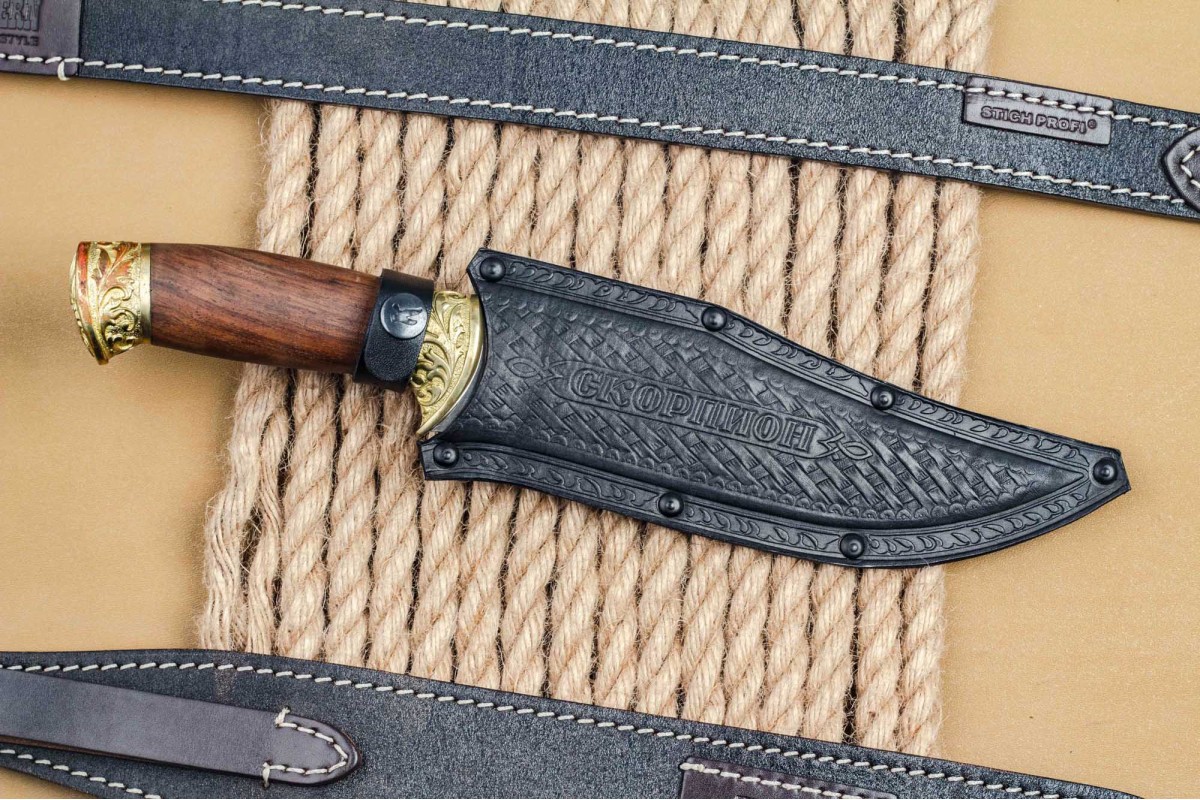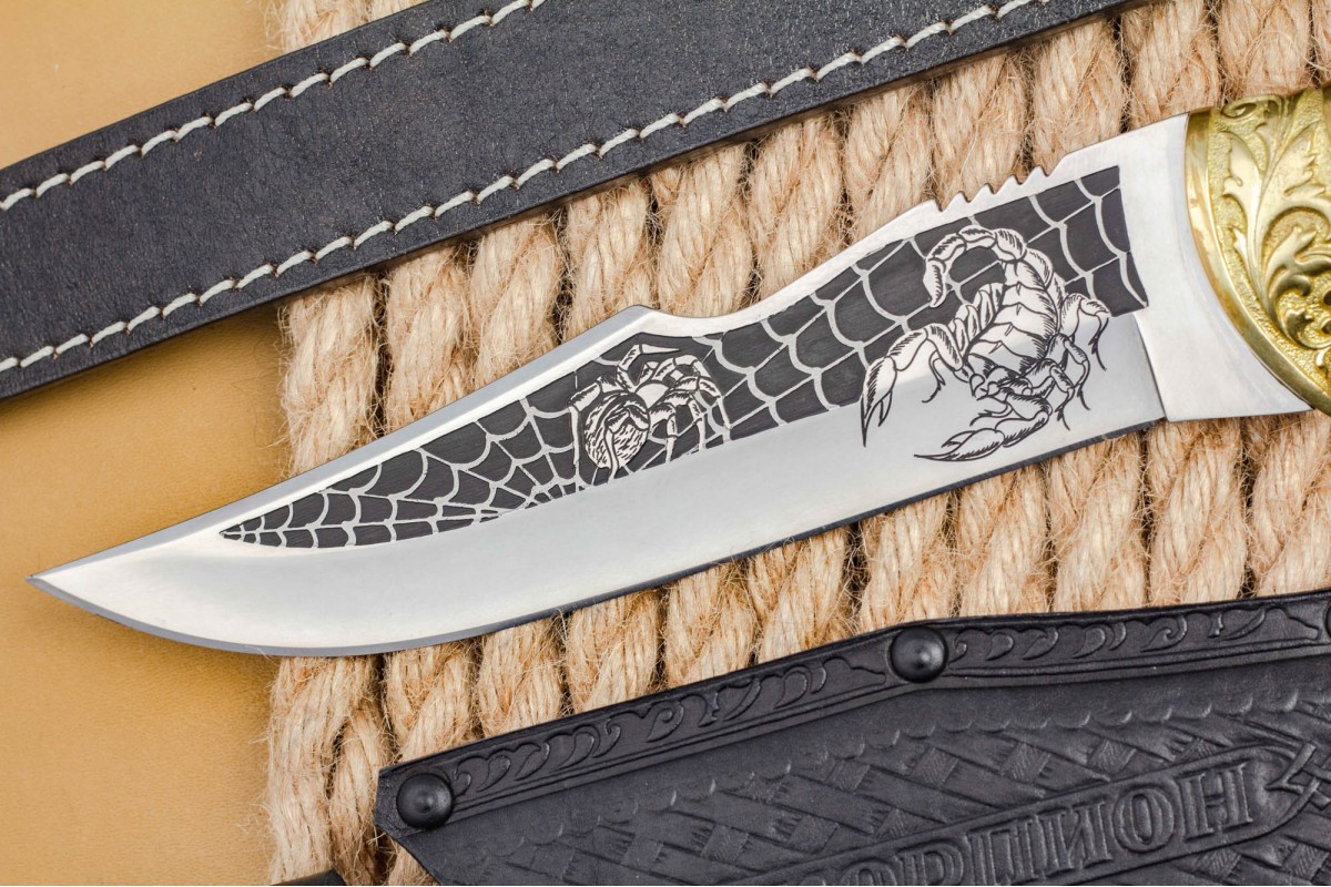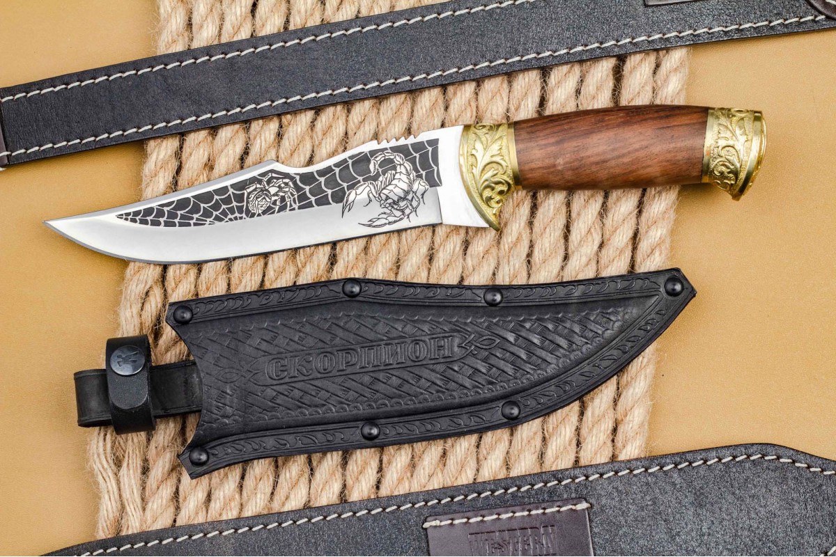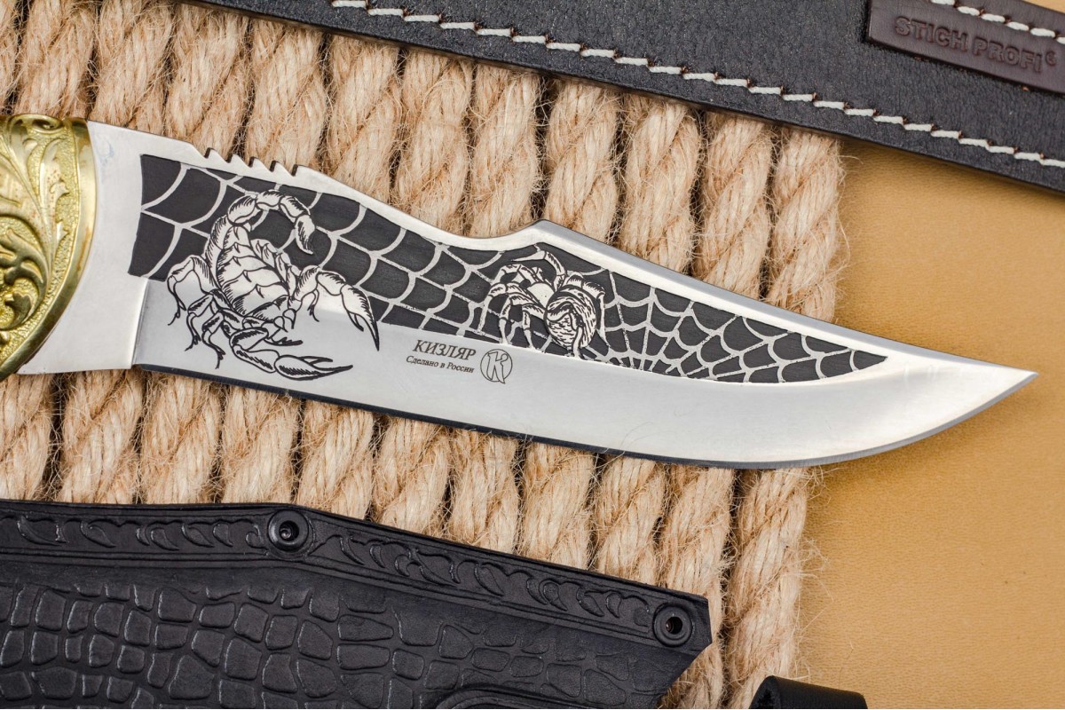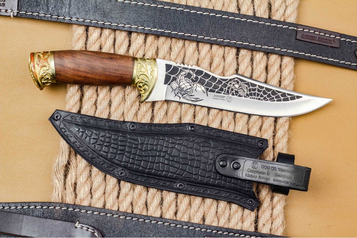 «Скорпион» - это первый нож, который стали выпускать на заводе ООО ПП «Кизляр» Его форма схожа с жалом скорпиона, также отдельные элементы ножа были использованы в проектировании логотипа компании. Несмотря на то что этой модели ножа больше десяти лет, он по-прежнему пользуется большим спросом.