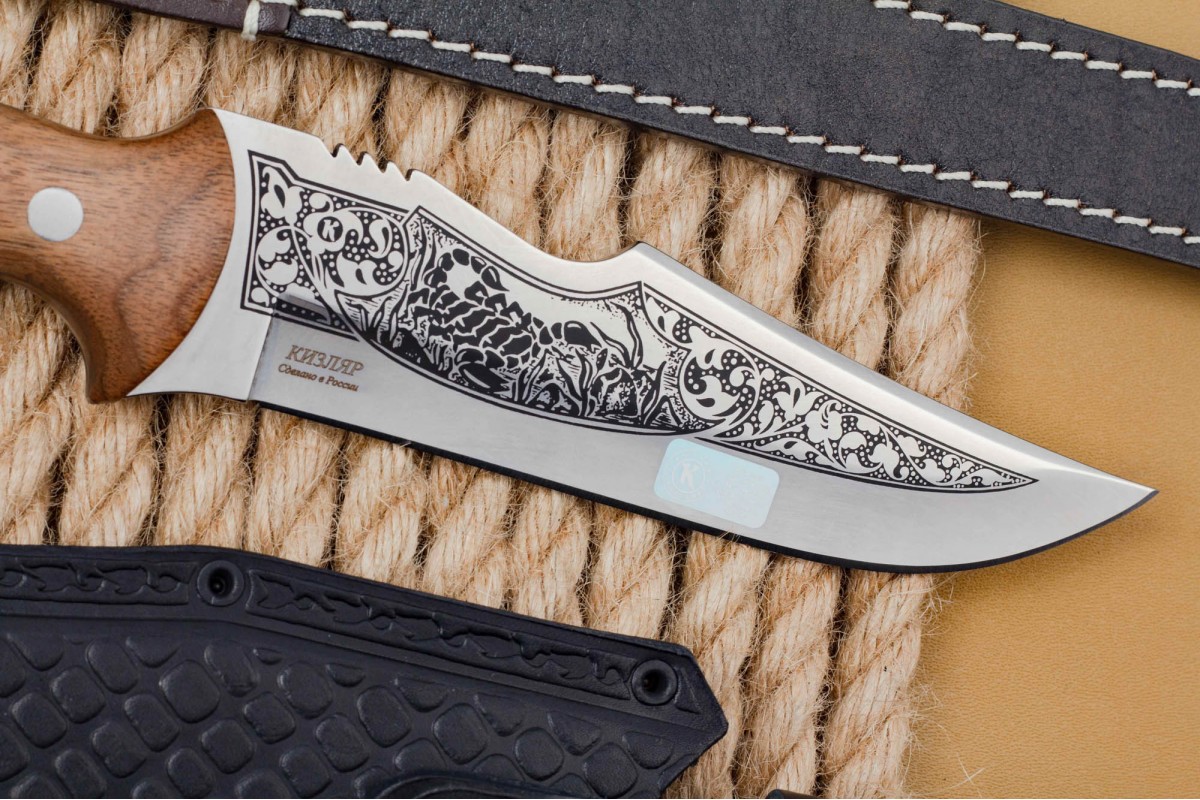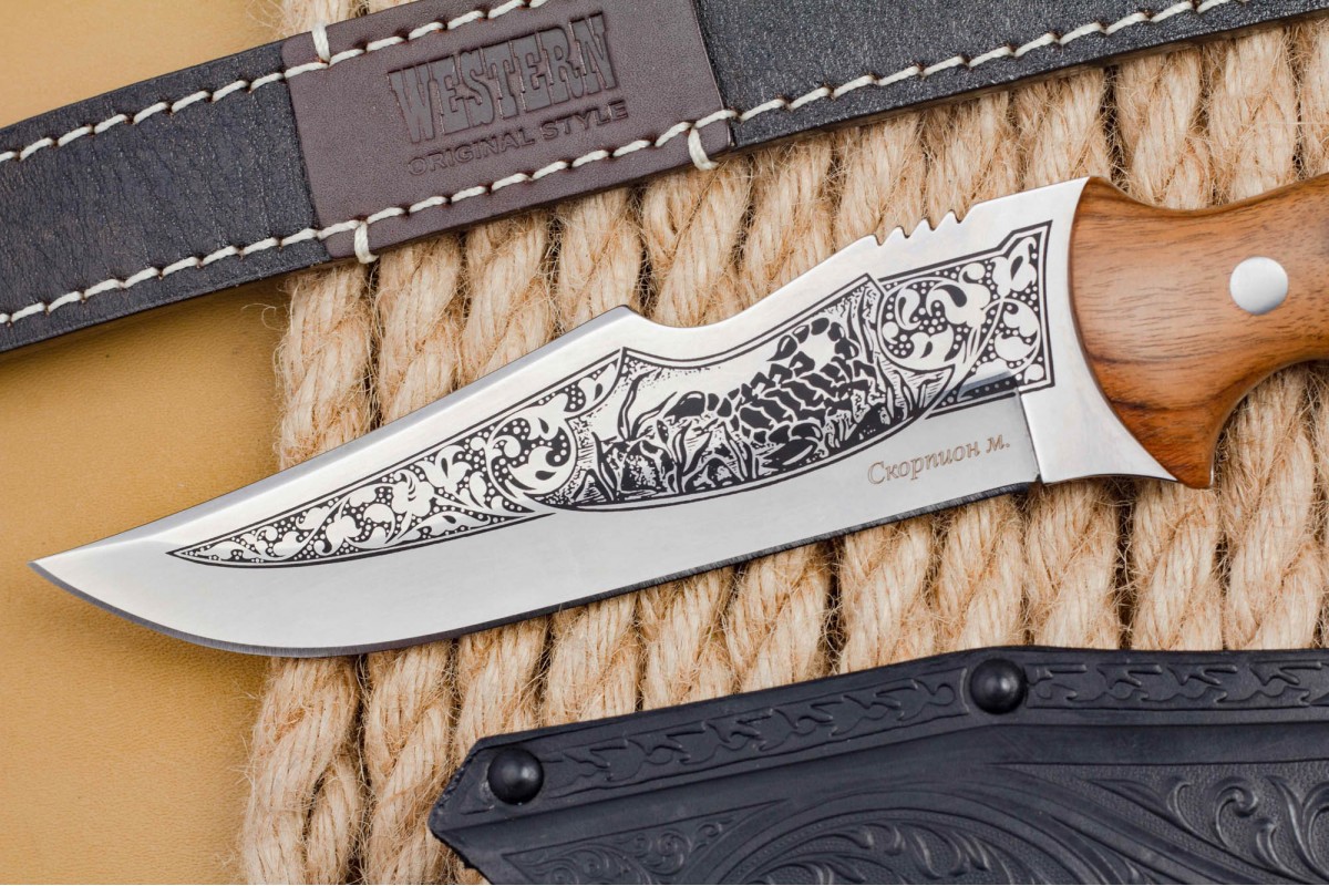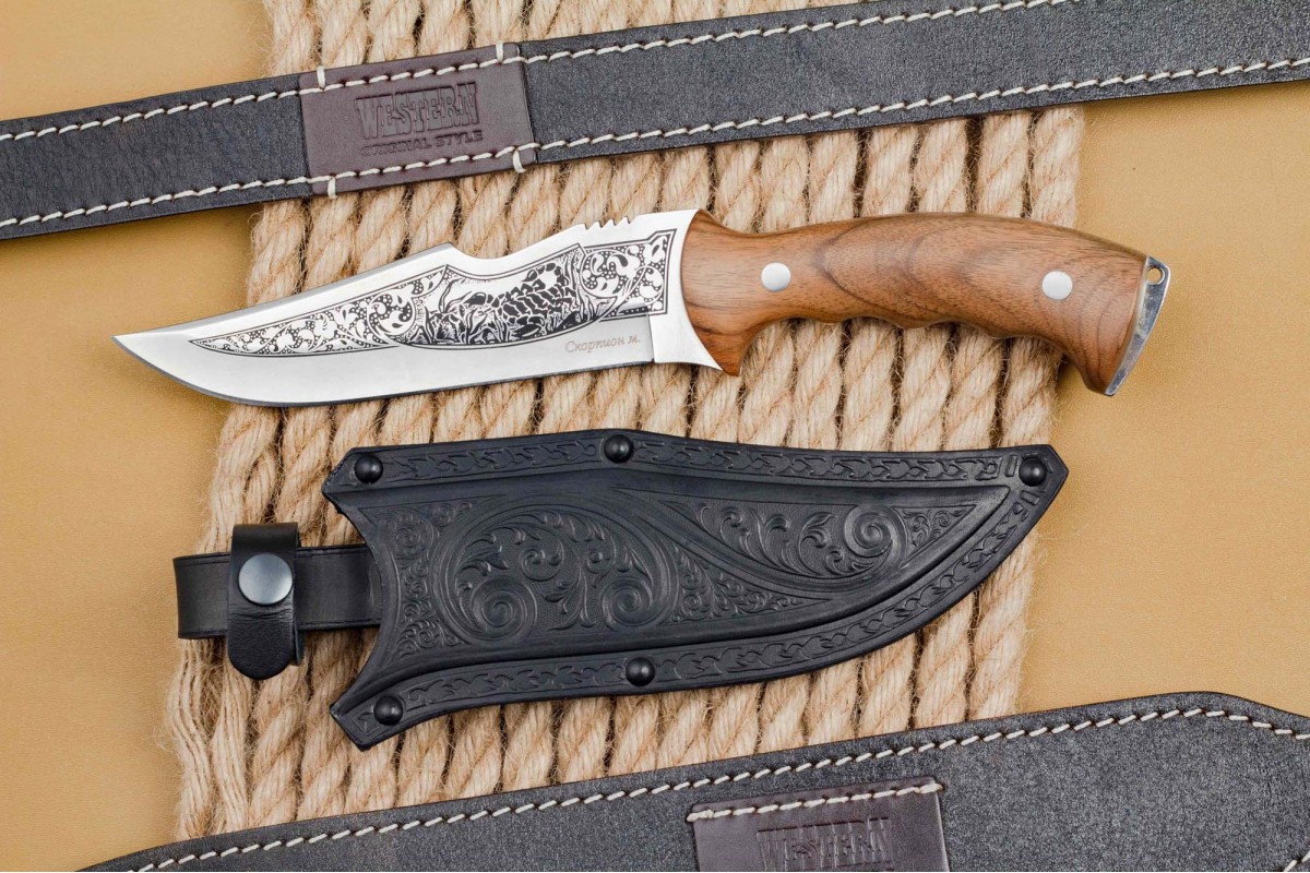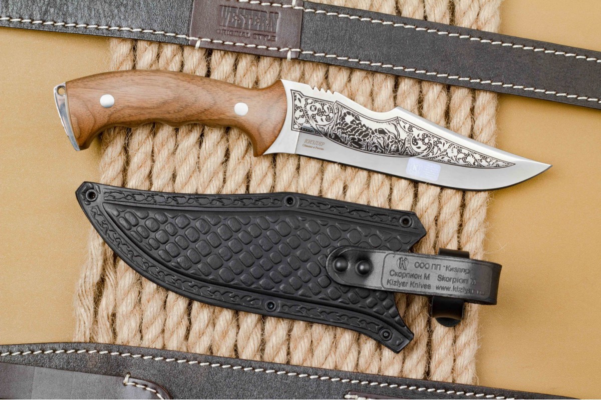 «Скорпион» - это первый нож, который стали выпускать на заводе ООО ПП «Кизляр» Его форма схожа с жалом скорпиона, также отдельные элементы ножа были использованы в проектировании логотипа компании. Несмотря на то что этой модели ножа больше десяти лет, он по-прежнему пользуется большим спросом.
