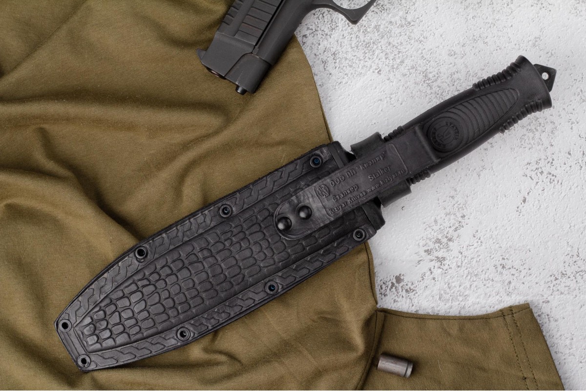 Сталкер – это нож на все случаи жизни. Где вы ни оказались: в лесу, в горах или в пустыне этот нож всегда выступит в роли незаменимого помощника. Форма клинка приспособлена для различных типов работ и задач. Клинок имеет изогнутую режущую кромку и симметричный обух. На части обуха имеется серрейторная заточка, которая на спуске к кончику переходит в режущую кромку. Клинок ножа выполнен из цельного куска метала. Устойчивая к коррозии сталь закалена до 57-59 HRC. Хвостовик проходит насквозь через рукоять, образуя на конце выступ-стеклобой. Рукоять выполнена из эластрона и оснащена цепкими насечками для лучшего хвата. Нож оснащен обрезиненной гардой. Для удобства ношения на поясе нож укомплектован ножнами из натуральной кожи с пластиковой вставкой, при необходимости, долполнительно можно приобрести ножны из пластика в нейлоновом чехле с креплением МОЛЛЕ