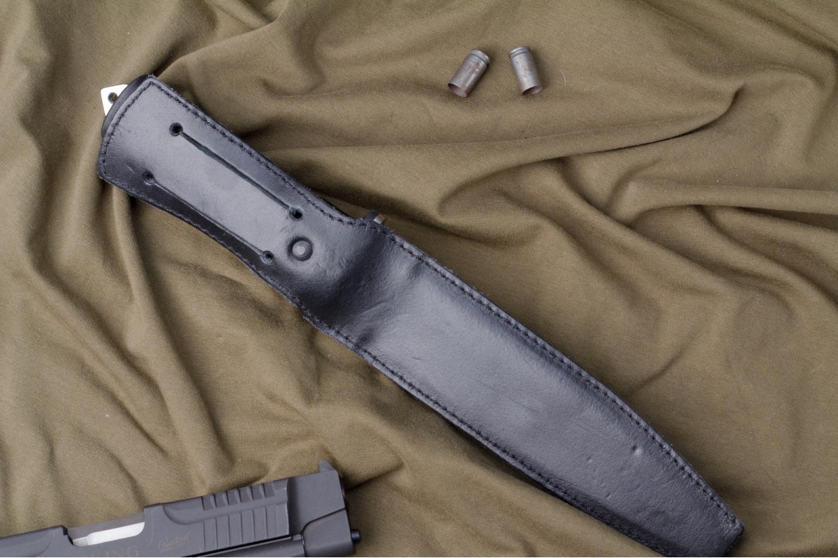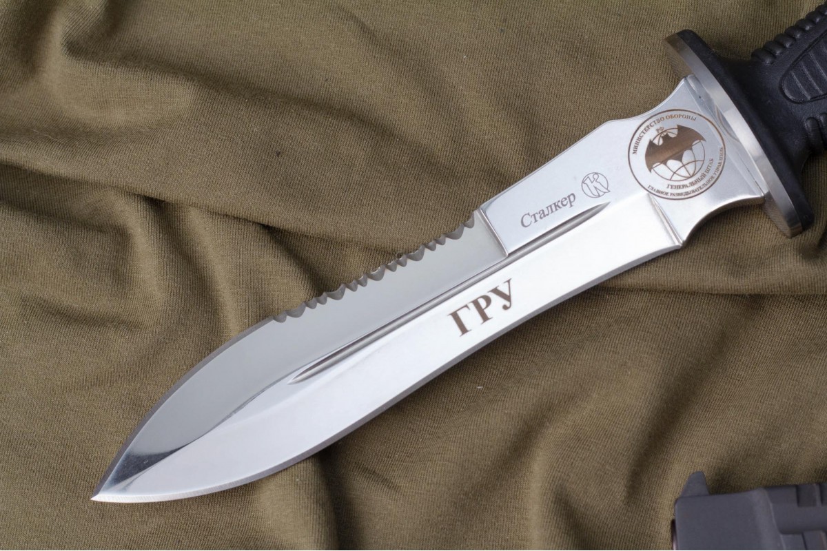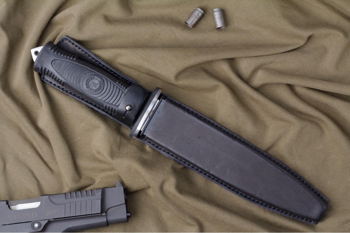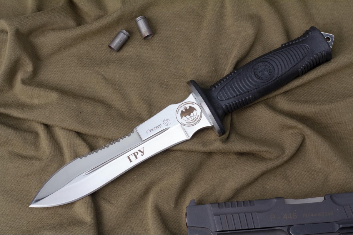 Сталкер – это нож на все случаи жизни. Где вы ни оказались: в лесу, в горах или в пустыне этот нож всегда выступит в роли незаменимого помощника. Форма клинка приспособлена для различных типов работ и задач. Клинок имеет изогнутую режущую кромку и симметричный обух. На части обуха имеется серрейторная заточка, которая на спуске к кончику переходит в режущую кромку. Клинок ножа выполнен из цельного куска метала. Устойчивая к коррозии сталь закалена до 57-59 HRC. Хвостовик проходит насквозь через рукоять, образуя на конце выступ-стеклобой. Рукоять выполнена из эластрона и оснащена цепкими насечками для лучшего хвата. Нож оснащен обрезиненной гардой. Для удобства ношения на поясе нож укомплектован ножнами из натуральной кожи с пластиковой вставкой, при необходимости, долполнительно можно приобрести ножны из пластика в нейлоновом чехле с креплением МОЛЛЕ
