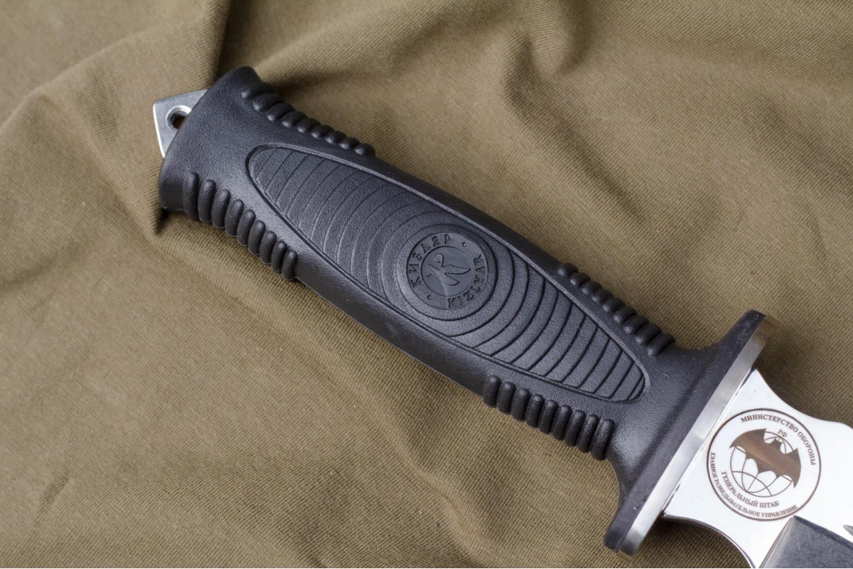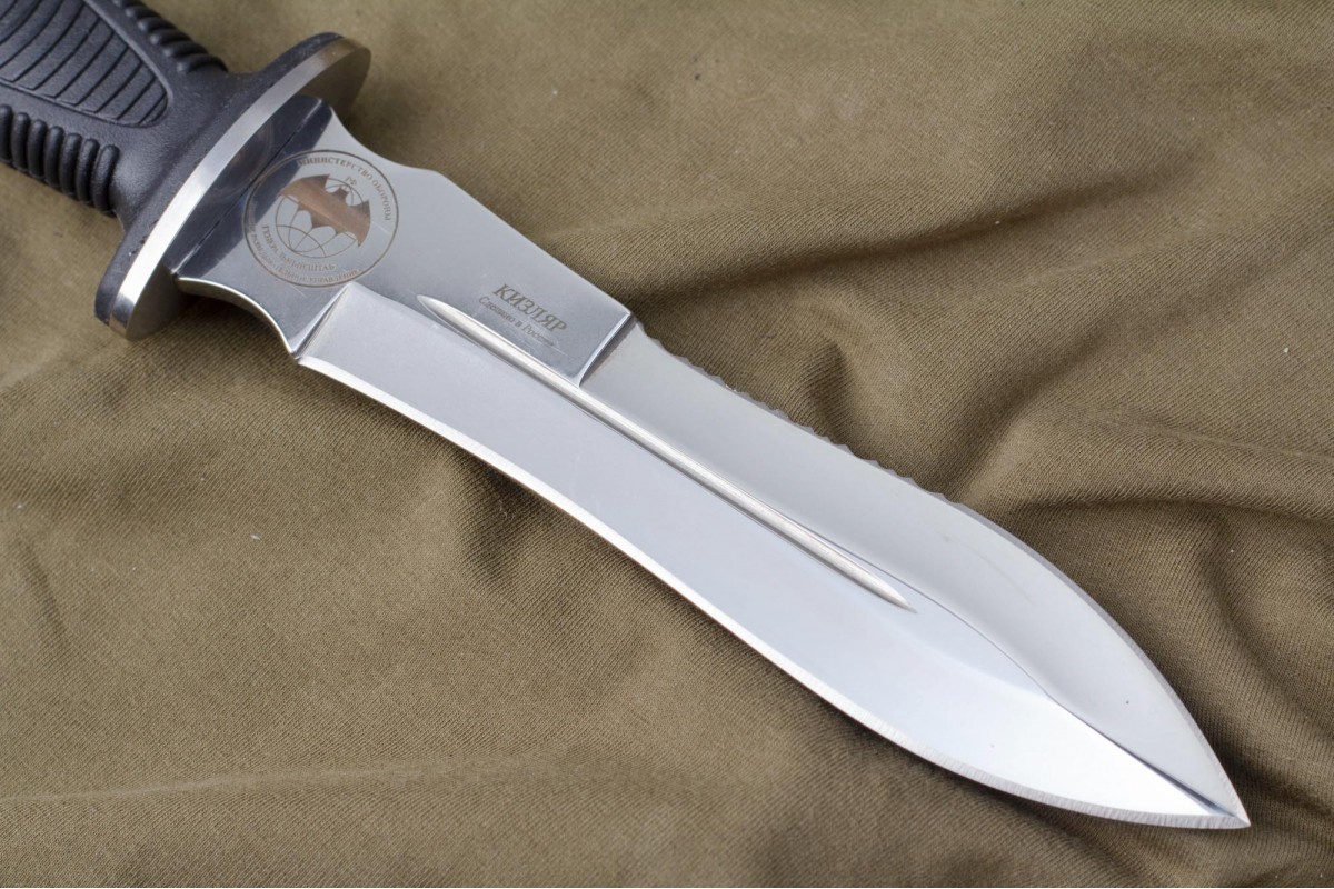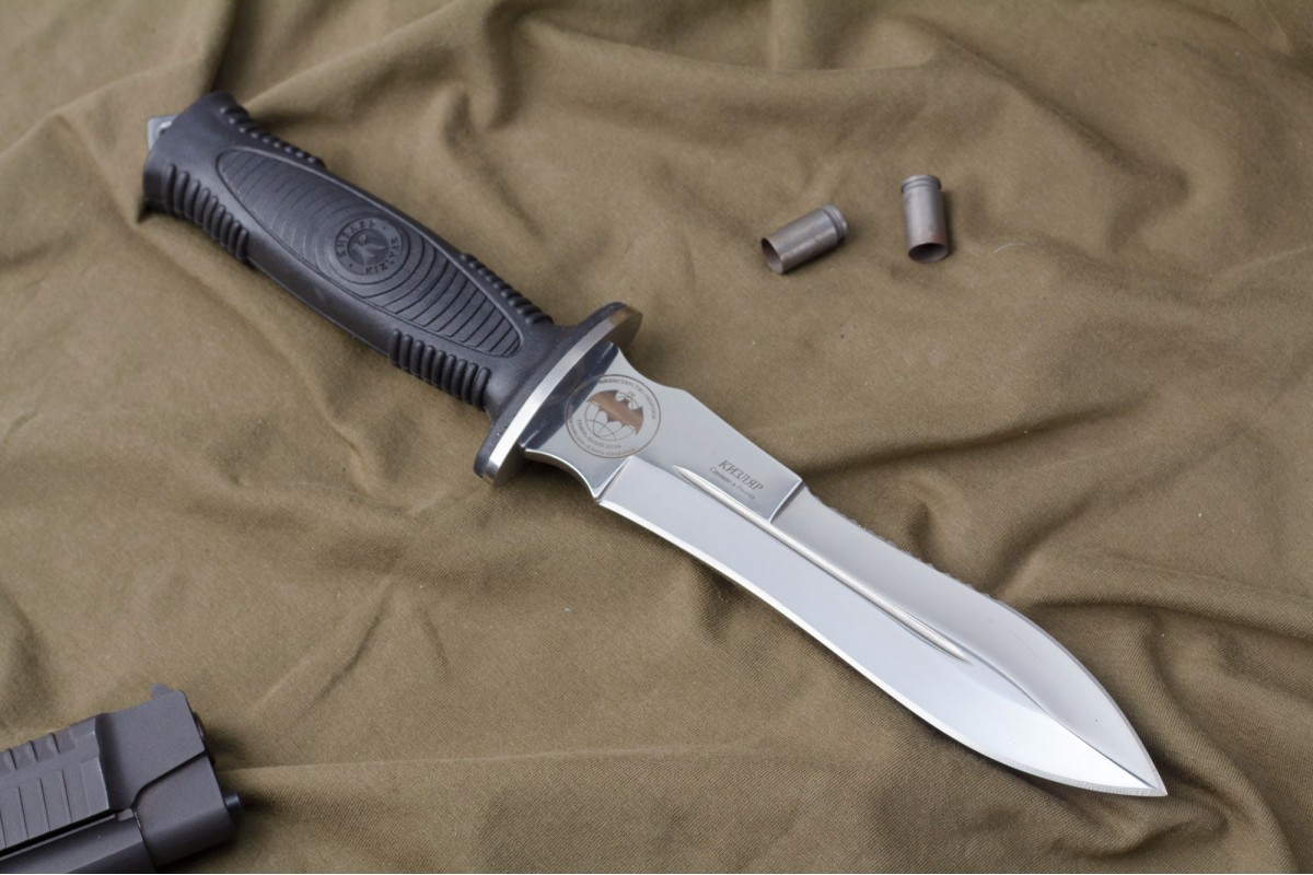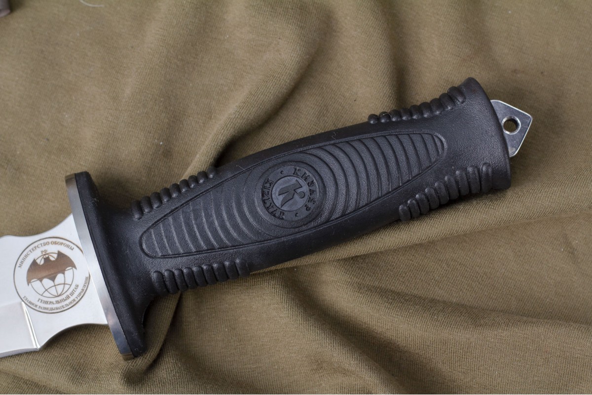 Сталкер – это нож на все случаи жизни. Где вы ни оказались: в лесу, в горах или в пустыне этот нож всегда выступит в роли незаменимого помощника. Форма клинка приспособлена для различных типов работ и задач. Клинок имеет изогнутую режущую кромку и симметричный обух. На части обуха имеется серрейторная заточка, которая на спуске к кончику переходит в режущую кромку. Клинок ножа выполнен из цельного куска метала. Устойчивая к коррозии сталь закалена до 57-59 HRC. Хвостовик проходит насквозь через рукоять, образуя на конце выступ-стеклобой. Рукоять выполнена из эластрона и оснащена цепкими насечками для лучшего хвата. Нож оснащен обрезиненной гардой. Для удобства ношения на поясе нож укомплектован ножнами из натуральной кожи с пластиковой вставкой, при необходимости, долполнительно можно приобрести ножны из пластика в нейлоновом чехле с креплением МОЛЛЕ