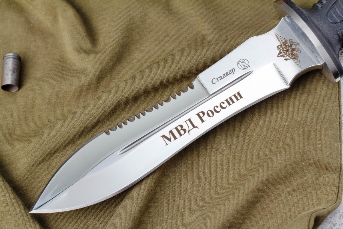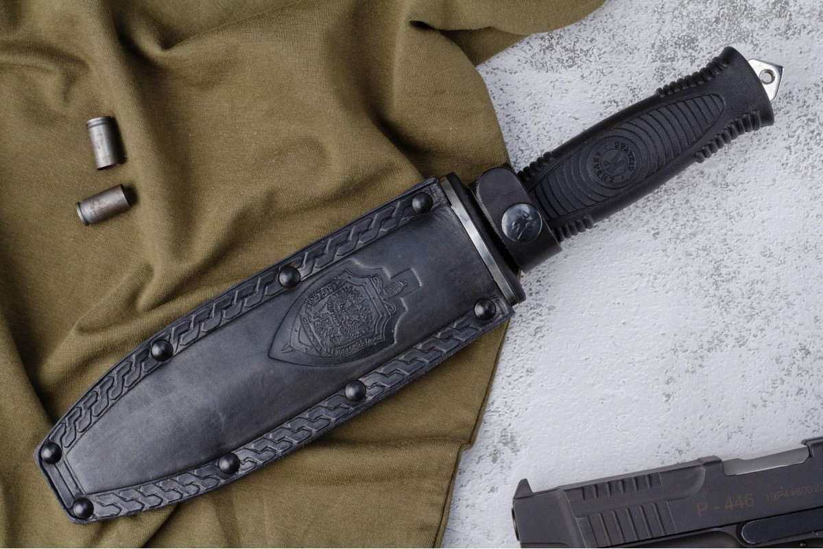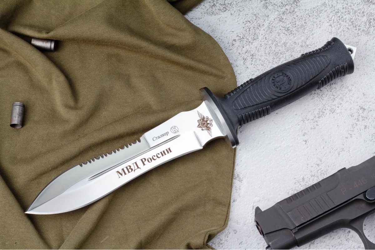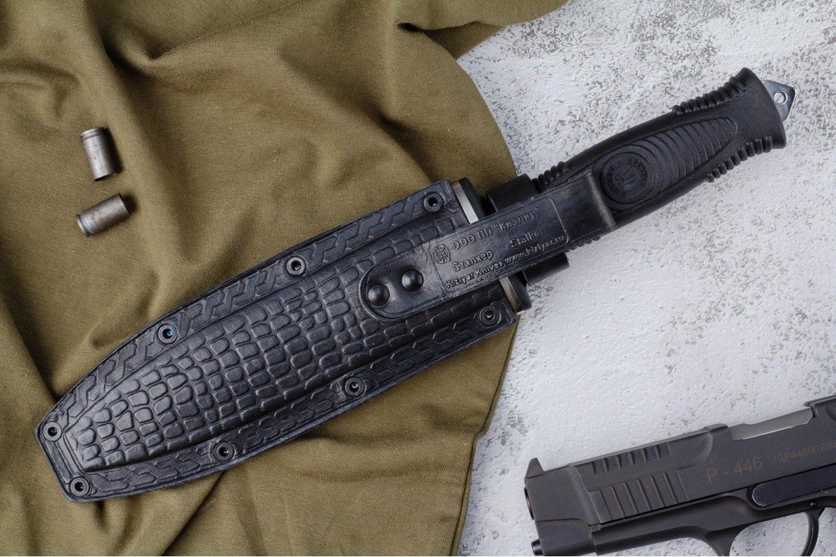 Сталкер – это нож на все случаи жизни. Где вы ни оказались: в лесу, в горах или в пустыне этот нож всегда выступит в роли незаменимого помощника. Форма клинка приспособлена для различных типов работ и задач. Клинок имеет изогнутую режущую кромку и симметричный обух. На части обуха имеется серрейторная заточка, которая на спуске к кончику переходит в режущую кромку. Клинок ножа выполнен из цельного куска метала. Устойчивая к коррозии сталь закалена до 57-59 HRC. Хвостовик проходит насквозь через рукоять, образуя на конце выступ-стеклобой. Рукоять выполнена из эластрона и оснащена цепкими насечками для лучшего хвата. Нож оснащен обрезиненной гардой. Для удобства ношения на поясе нож укомплектован ножнами из натуральной кожи с пластиковой вставкой, при необходимости, долполнительно можно приобрести ножны из пластика в нейлоновом чехле с креплением МОЛЛЕ