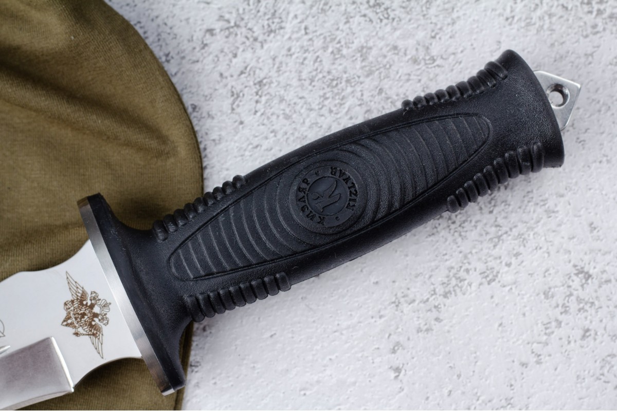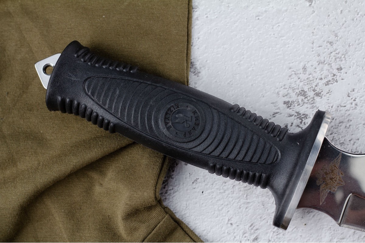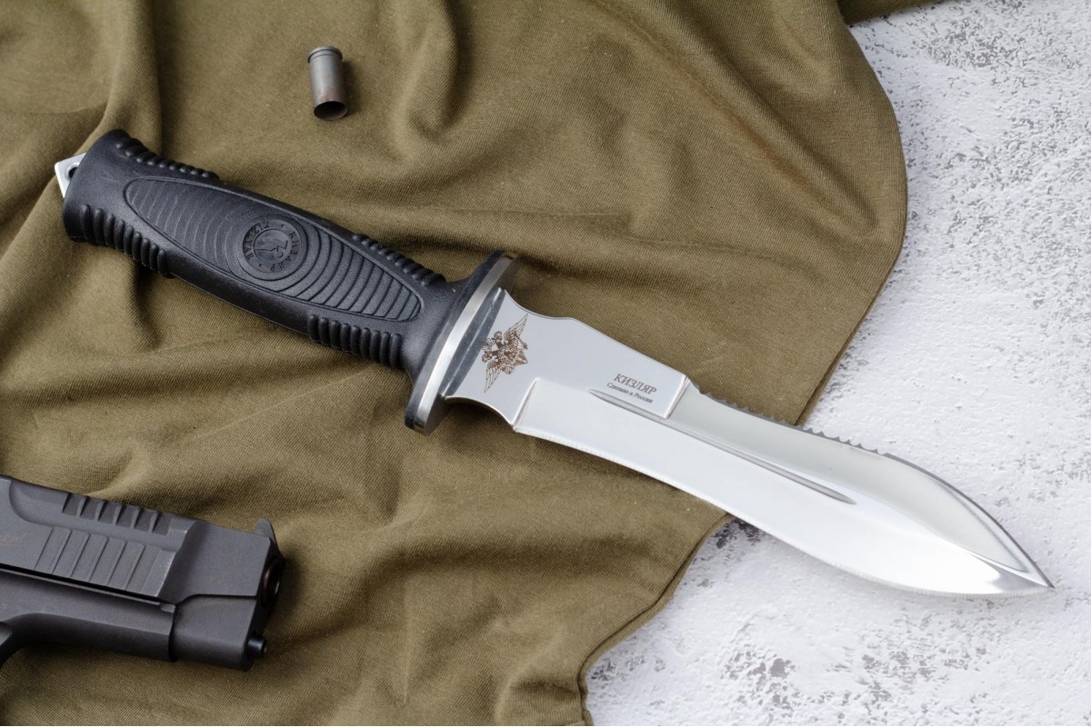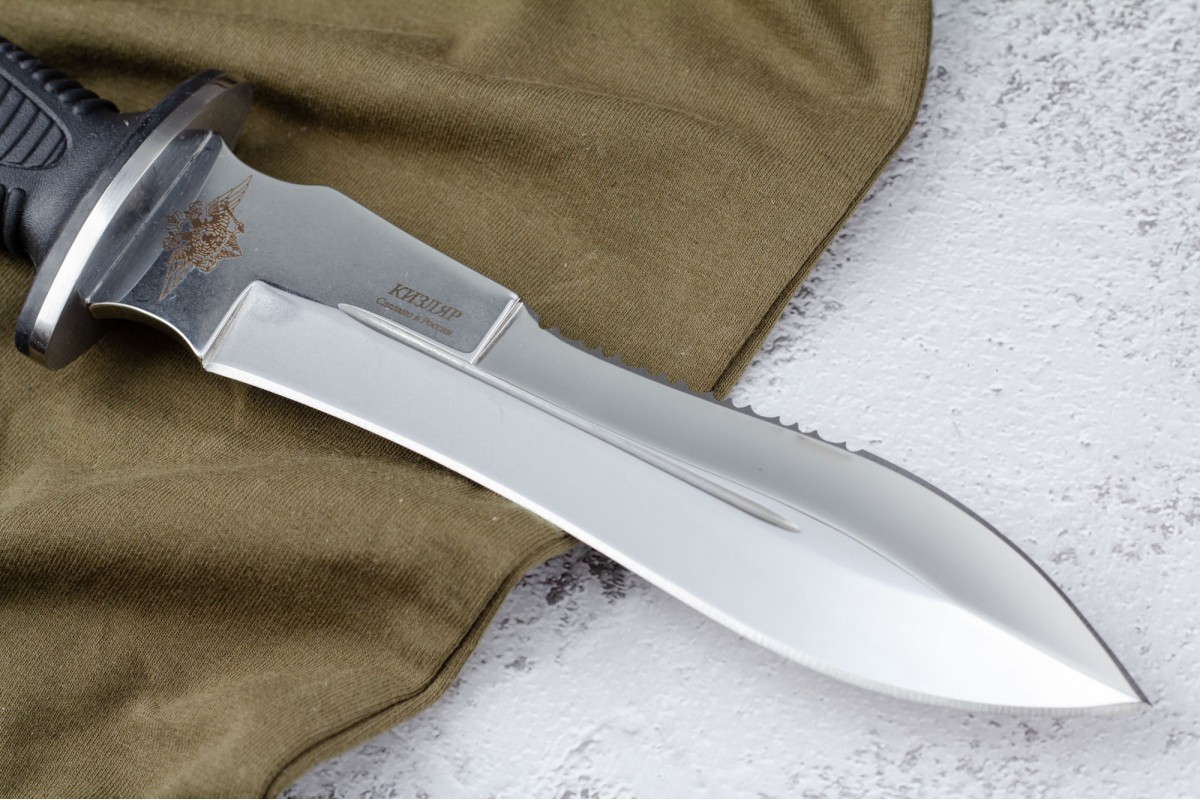 Сталкер – это нож на все случаи жизни. Где вы ни оказались: в лесу, в горах или в пустыне этот нож всегда выступит в роли незаменимого помощника. Форма клинка приспособлена для различных типов работ и задач. Клинок имеет изогнутую режущую кромку и симметричный обух. На части обуха имеется серрейторная заточка, которая на спуске к кончику переходит в режущую кромку. Клинок ножа выполнен из цельного куска метала. Устойчивая к коррозии сталь закалена до 57-59 HRC. Хвостовик проходит насквозь через рукоять, образуя на конце выступ-стеклобой. Рукоять выполнена из эластрона и оснащена цепкими насечками для лучшего хвата. Нож оснащен обрезиненной гардой. Для удобства ношения на поясе нож укомплектован ножнами из натуральной кожи с пластиковой вставкой, при необходимости, долполнительно можно приобрести ножны из пластика в нейлоновом чехле с креплением МОЛЛЕ