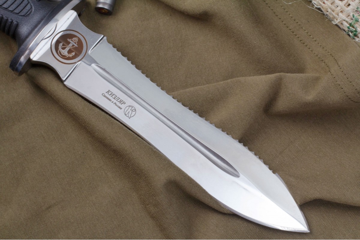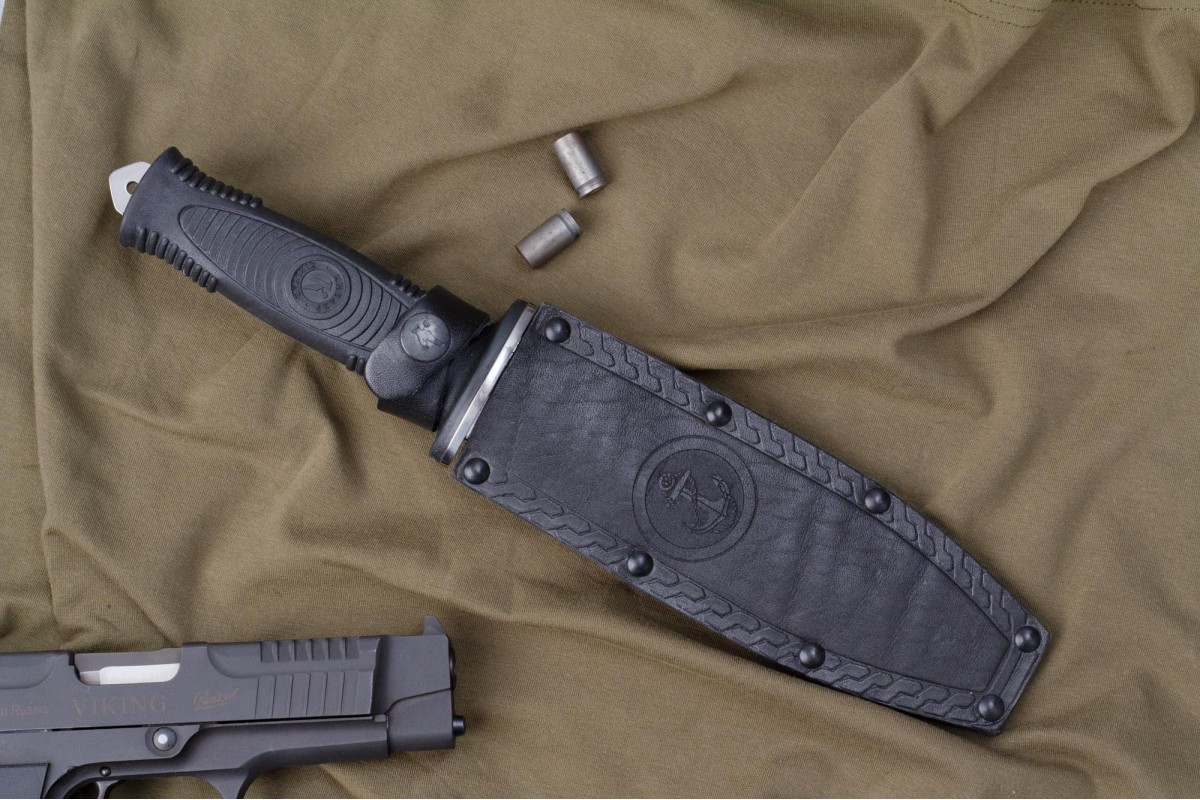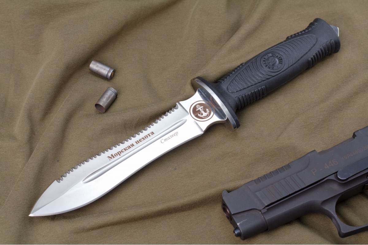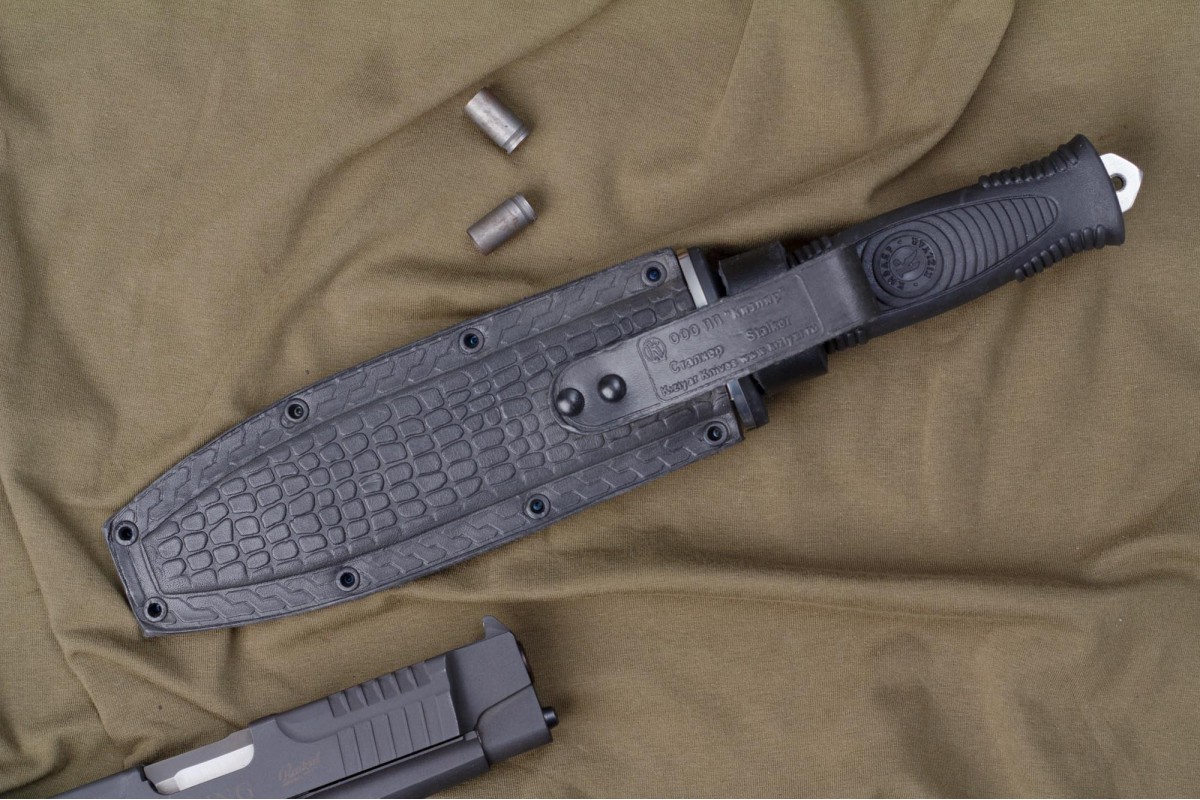 Сталкер – это нож на все случаи жизни. Где вы ни оказались: в лесу, в горах или в пустыне этот нож всегда выступит в роли незаменимого помощника. Форма клинка приспособлена для различных типов работ и задач. Клинок имеет изогнутую режущую кромку и симметричный обух. На части обуха имеется серрейторная заточка, которая на спуске к кончику переходит в режущую кромку. Клинок ножа выполнен из цельного куска метала. Устойчивая к коррозии сталь закалена до 57-59 HRC. Хвостовик проходит насквозь через рукоять, образуя на конце выступ-стеклобой. Рукоять выполнена из эластрона и оснащена цепкими насечками для лучшего хвата. Нож оснащен обрезиненной гардой. Для удобства ношения на поясе нож укомплектован ножнами из натуральной кожи с пластиковой вставкой, при необходимости, долполнительно можно приобрести ножны из пластика в нейлоновом чехле с креплением МОЛЛЕ