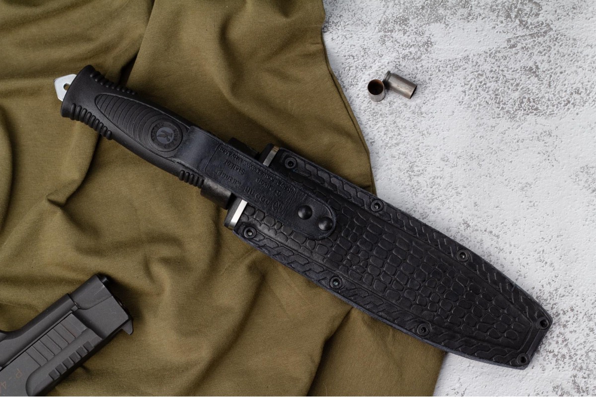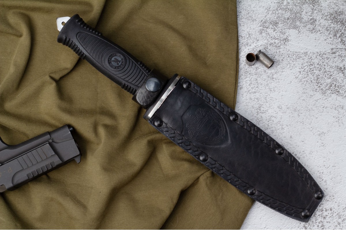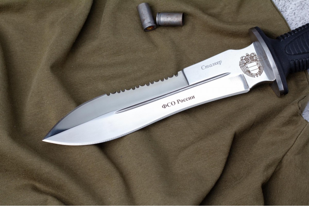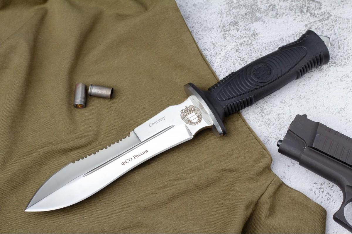 Сталкер – это нож на все случаи жизни. Где вы ни оказались: в лесу, в горах или в пустыне этот нож всегда выступит в роли незаменимого помощника. Форма клинка приспособлена для различных типов работ и задач. Клинок имеет изогнутую режущую кромку и симметричный обух. На части обуха имеется серрейторная заточка, которая на спуске к кончику переходит в режущую кромку. Клинок ножа выполнен из цельного куска метала. Устойчивая к коррозии сталь закалена до 57-59 HRC. Хвостовик проходит насквозь через рукоять, образуя на конце выступ-стеклобой. Рукоять выполнена из эластрона и оснащена цепкими насечками для лучшего хвата. Нож оснащен обрезиненной гардой. Для удобства ношения на поясе нож укомплектован ножнами из натуральной кожи с пластиковой вставкой, при необходимости, долполнительно можно приобрести ножны из пластика в нейлоновом чехле с креплением МОЛЛЕ