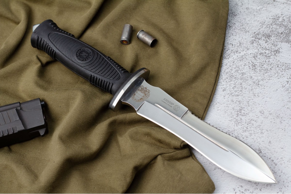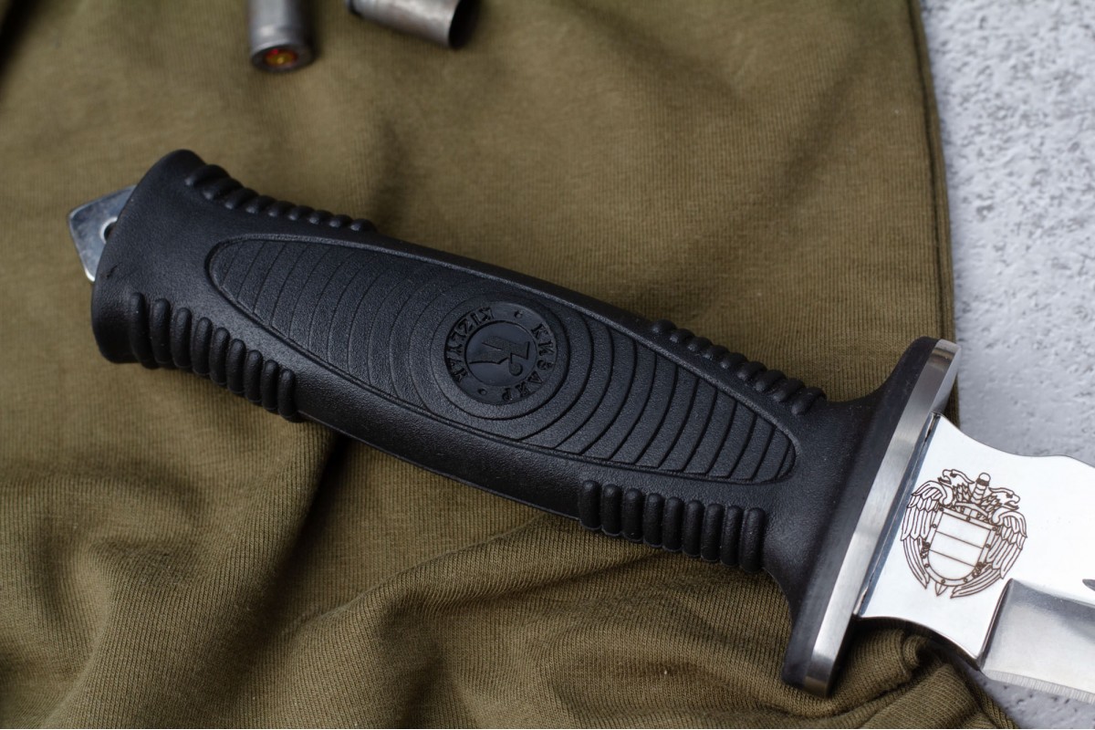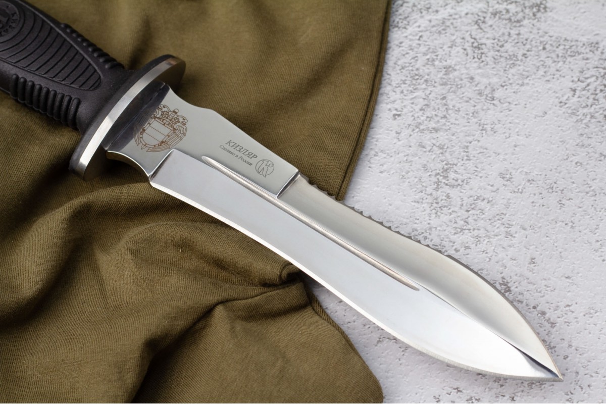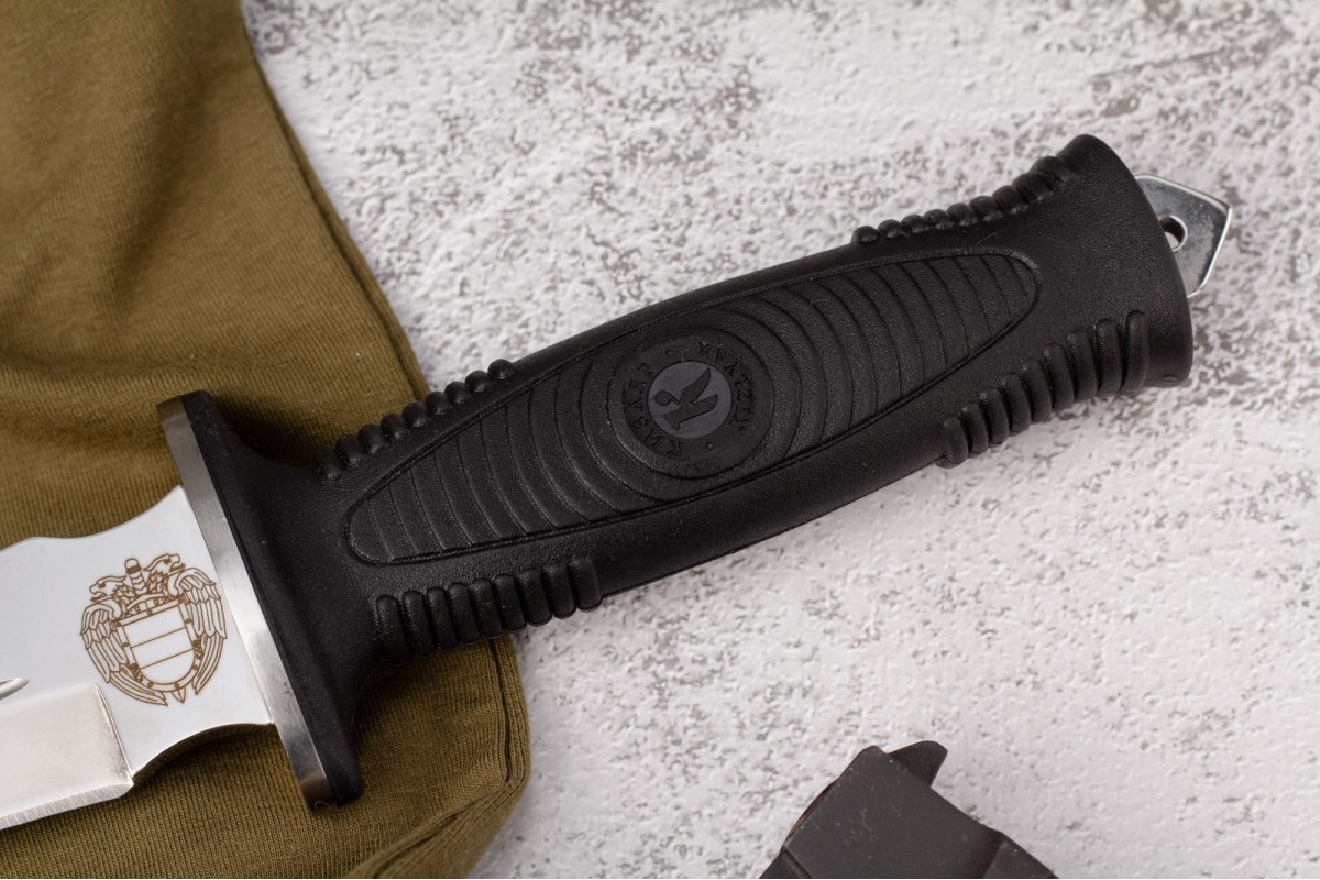 Сталкер – это нож на все случаи жизни. Где вы ни оказались: в лесу, в горах или в пустыне этот нож всегда выступит в роли незаменимого помощника. Форма клинка приспособлена для различных типов работ и задач. Клинок имеет изогнутую режущую кромку и симметричный обух. На части обуха имеется серрейторная заточка, которая на спуске к кончику переходит в режущую кромку. Клинок ножа выполнен из цельного куска метала. Устойчивая к коррозии сталь закалена до 57-59 HRC. Хвостовик проходит насквозь через рукоять, образуя на конце выступ-стеклобой. Рукоять выполнена из эластрона и оснащена цепкими насечками для лучшего хвата. Нож оснащен обрезиненной гардой. Для удобства ношения на поясе нож укомплектован ножнами из натуральной кожи с пластиковой вставкой, при необходимости, долполнительно можно приобрести ножны из пластика в нейлоновом чехле с креплением МОЛЛЕ