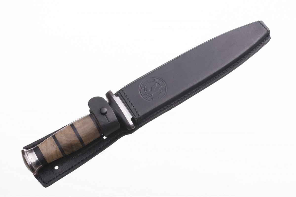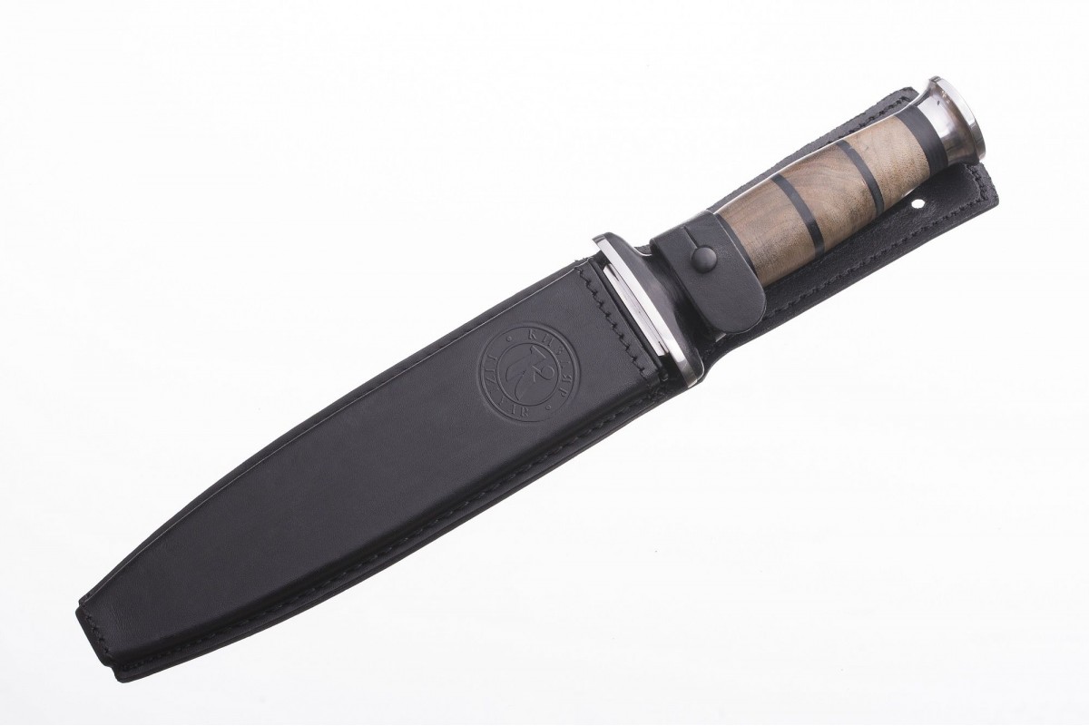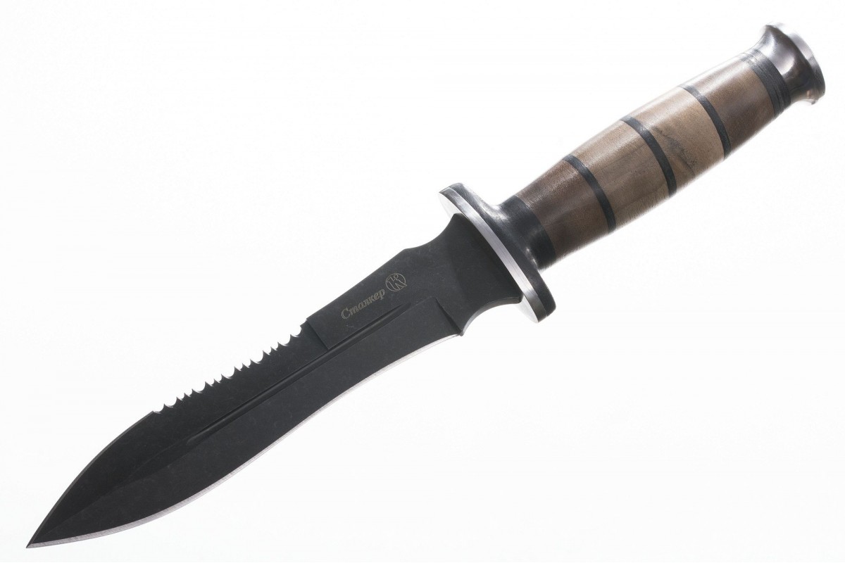 Сталкер – это нож на все случаи жизни. Где вы ни оказались: в лесу, в горах или в пустыне этот нож всегда выступит в роли незаменимого помощника. Форма клинка приспособлена для различных типов работ и задач. Клинок имеет изогнутую режущую кромку и симметричный обух. На части обуха имеется серрейторная заточка, которая на спуске к кончику переходит в режущую кромку. Клинок ножа выполнен из цельного куска метала. Устойчивая к коррозии сталь закалена до 57-59 HRC. Хвостовик проходит насквозь через рукоять, образуя на конце выступ-стеклобой. Рукоять выполнена из эластрона и оснащена цепкими насечками для лучшего хвата. Нож оснащен обрезиненной гардой. Для удобства ношения на поясе нож укомплектован ножнами из натуральной кожи с пластиковой вставкой, при необходимости, долполнительно можно приобрести ножны из пластика в нейлоновом чехле с креплением МОЛЛЕ
