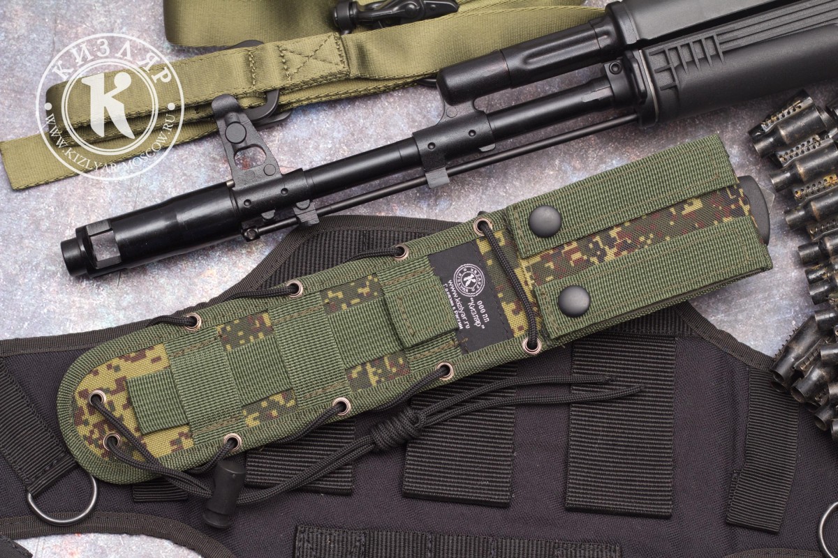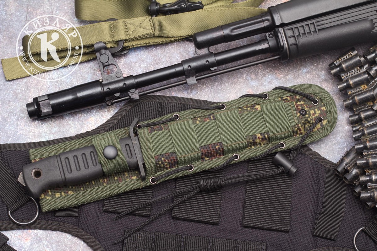 Уже традиционно для ПП Кизляр рукоять выполнена из эластрона, который за 20 лет работы зарекомендовал себя только с самой лучшей стороны. Рельефная рукоять имеет отличную геометрию, позволяющую уверенно удерживать нож даже мокрой и грязной рукой. Для повышения удобства использования в конструкции ножа предусмотрено темляное отверстие. В навершии имеется стеклобой.