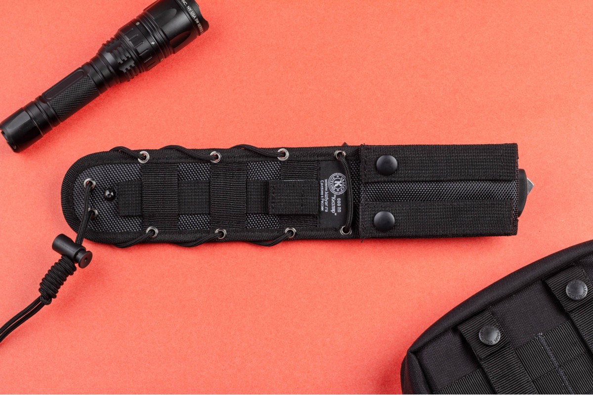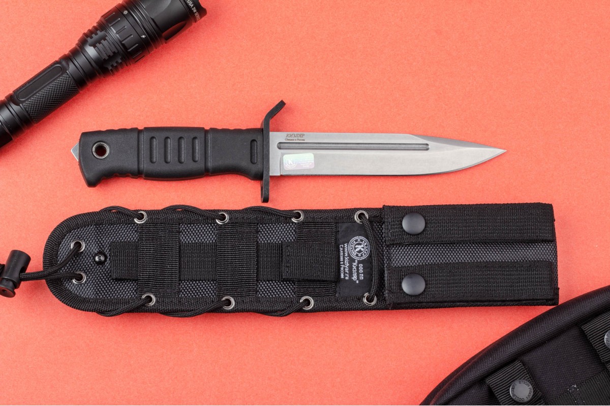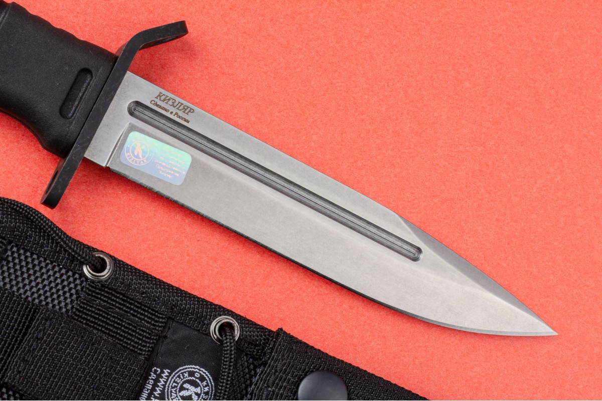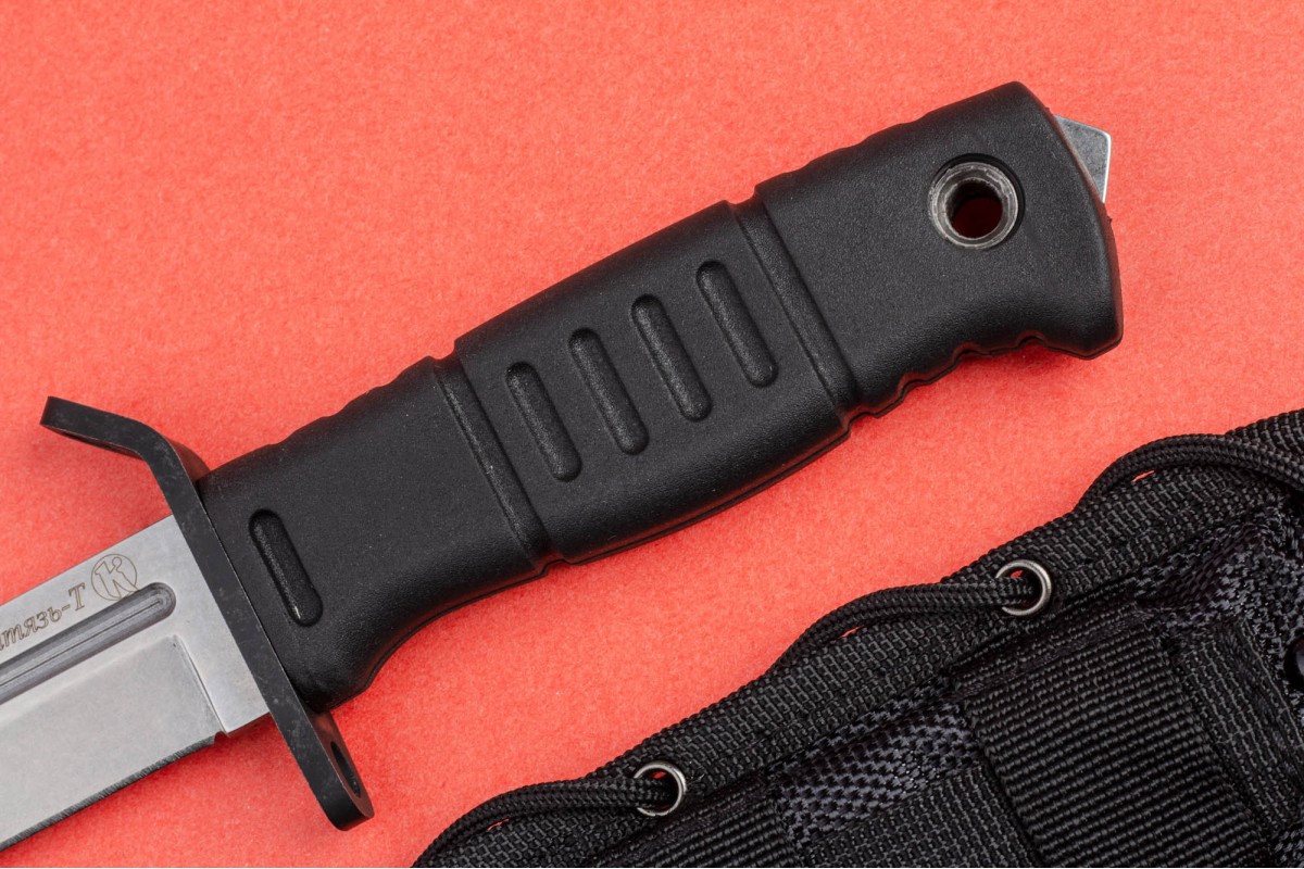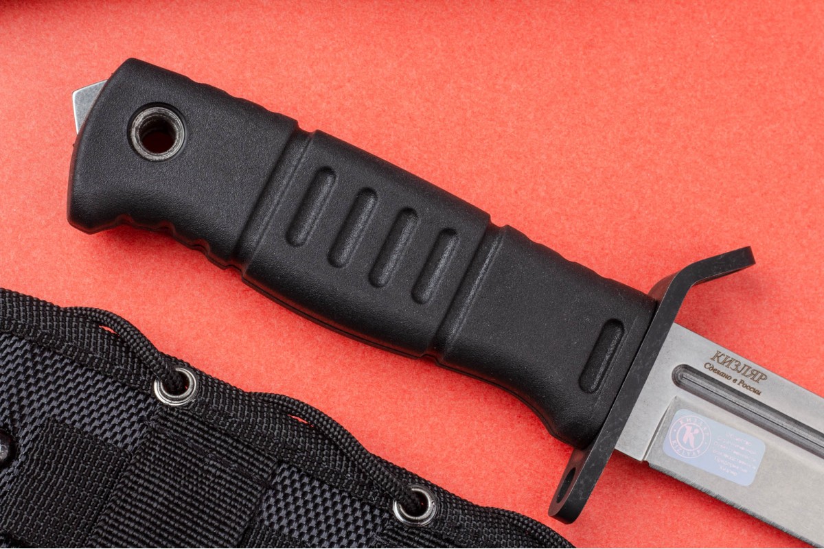 Уже традиционно для ПП Кизляр рукоять выполнена из эластрона, который за 20 лет работы зарекомендовал себя только с самой лучшей стороны. Рельефная рукоять имеет отличную геометрию, позволяющую уверенно удерживать нож даже мокрой и грязной рукой. Для повышения удобства использования в конструкции ножа предусмотрено темляное отверстие. В навершии имеется стеклобой.