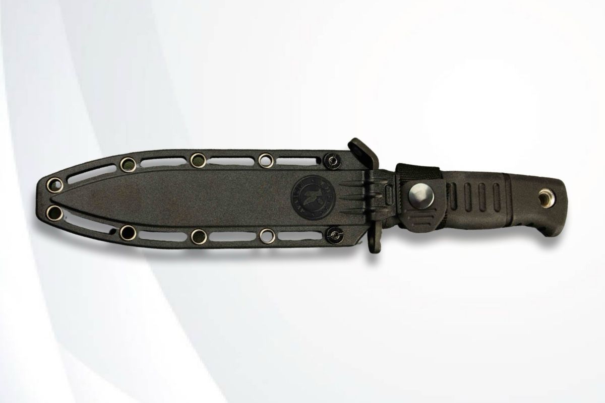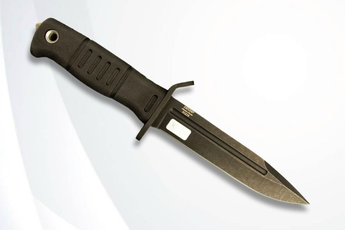Уже традиционно для ПП Кизляр рукоять выполнена из эластрона, который за 20 лет работы зарекомендовал себя только с самой лучшей стороны. Рельефная рукоять имеет отличную геометрию, позволяющую уверенно удерживать нож даже мокрой и грязной рукой. Для повышения удобства использования в конструкции ножа предусмотрено темляное отверстие. В навершии имеется стеклобой.