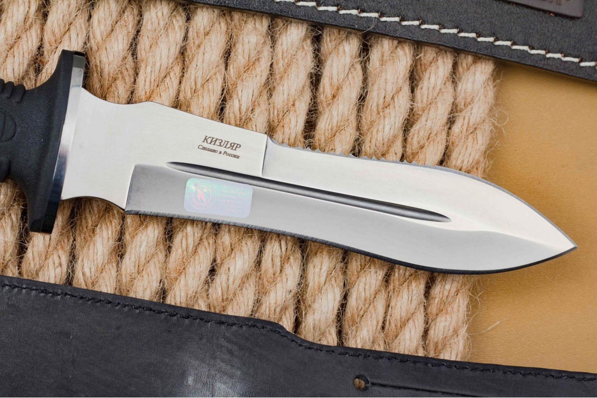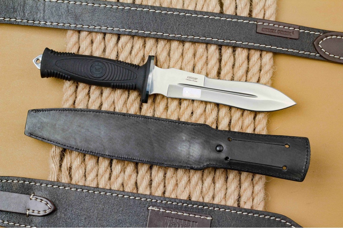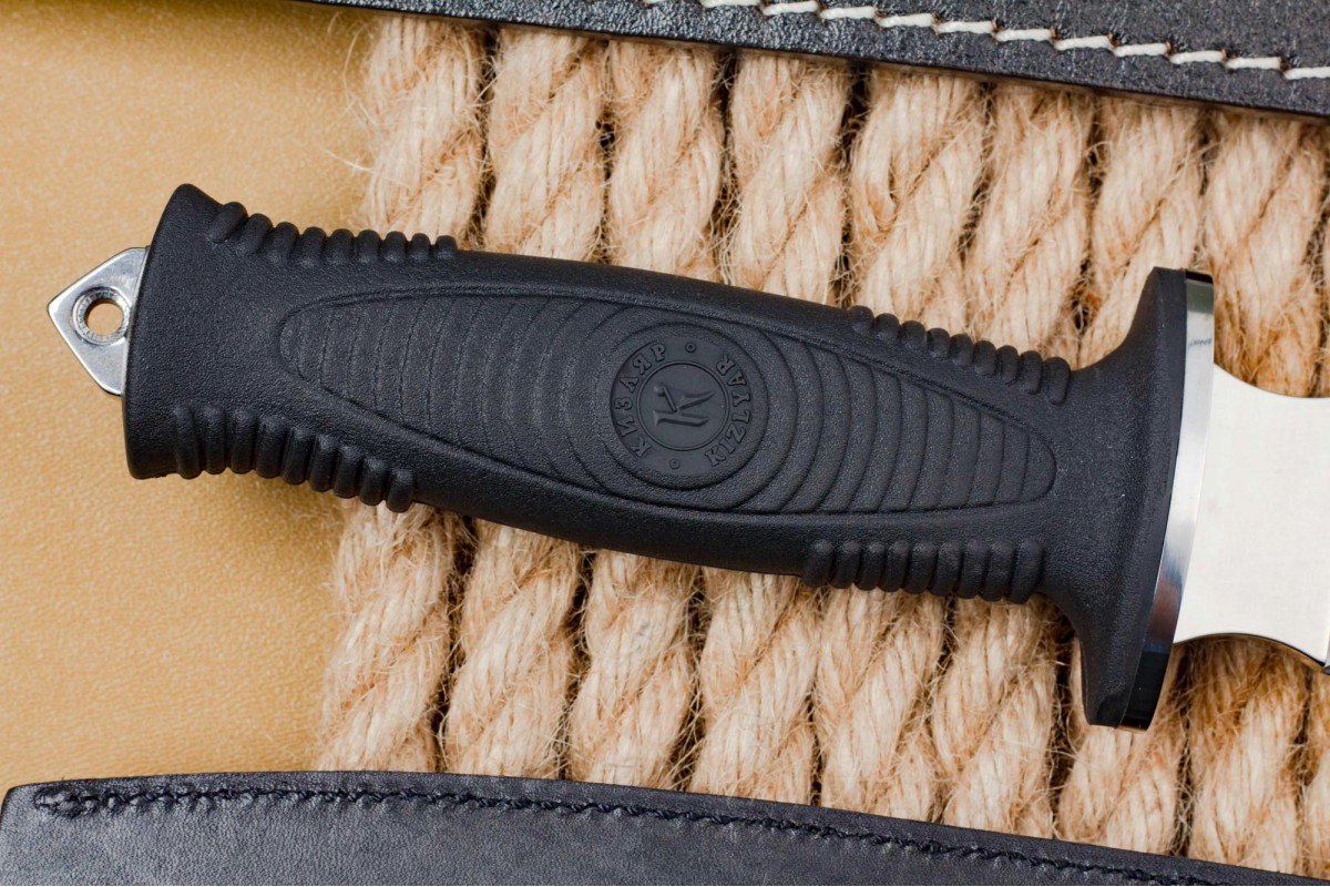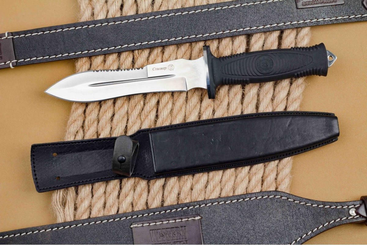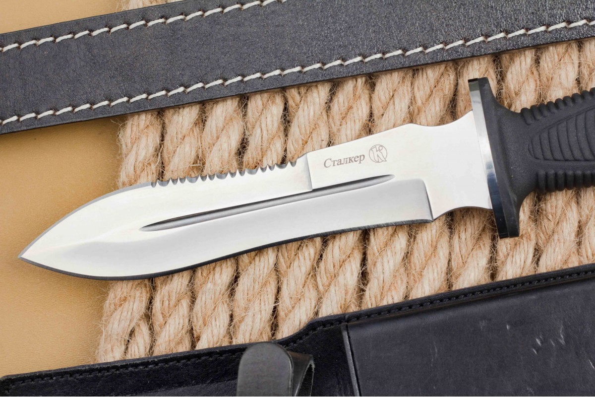 Сталкер – это нож на все случаи жизни. Где вы ни оказались: в лесу, в горах или в пустыне этот нож всегда выступит в роли незаменимого помощника. Форма клинка приспособлена для различных типов работ и задач. Клинок имеет изогнутую режущую кромку и симметричный обух. На части обуха имеется серрейторная заточка, которая на спуске к кончику переходит в режущую кромку. Клинок ножа выполнен из цельного куска метала. Устойчивая к коррозии сталь закалена до 57-59 HRC. Хвостовик проходит насквозь через рукоять, образуя на конце выступ-стеклобой. Рукоять выполнена из эластрона и оснащена цепкими насечками для лучшего хвата. Нож оснащен обрезиненной гардой. Для удобства ношения на поясе нож укомплектован ножнами из натуральной кожи с пластиковой вставкой, при необходимости, долполнительно можно приобрести ножны из пластика в нейлоновом чехле с креплением МОЛЛЕ