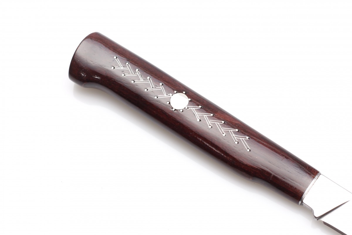Рукоять ножа Канцлер дополнена насечкой металлом (унцукульская насечка). Данный вид ремесла является традиционным для Республики Дагестан и насчитывает многовековую историю. Такая работа выполняется исключительно вручную, что придает изделию дополнительную ценность и значимость. Мы стараемся воплотить в наших издеиях исключительно лучшие традиции мастеров, прославивиших Дагестан на весь мир.