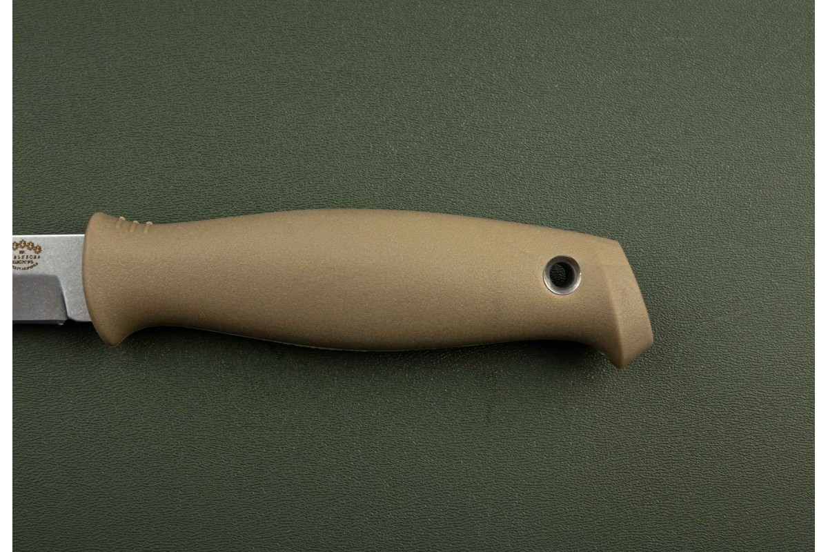 Рукоять выполнена из эластрона, прочного и эргономичного материала. Эластрон обеспечивает надежный захват и комфорт при работе с ножом, предотвращая скольжение во время использования. Благодаря своей прочности и стойкости к воздействию влаги, рукоять из эластрона идеально подходит для использования в кухне или в условиях активного отдыха на природе.
