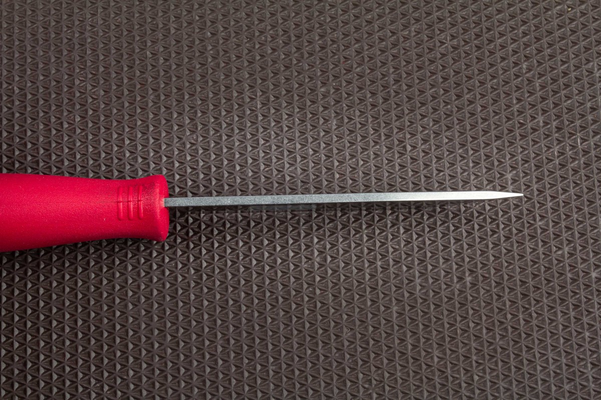 Нож имеет прямую заточку от середины клинка. Такая заточка обеспечивает идеальное соотношение остроты и прочности. Она позволяет легко проникать в плотные и твердые продукты, обеспечивая точность и контроль во время разделки.