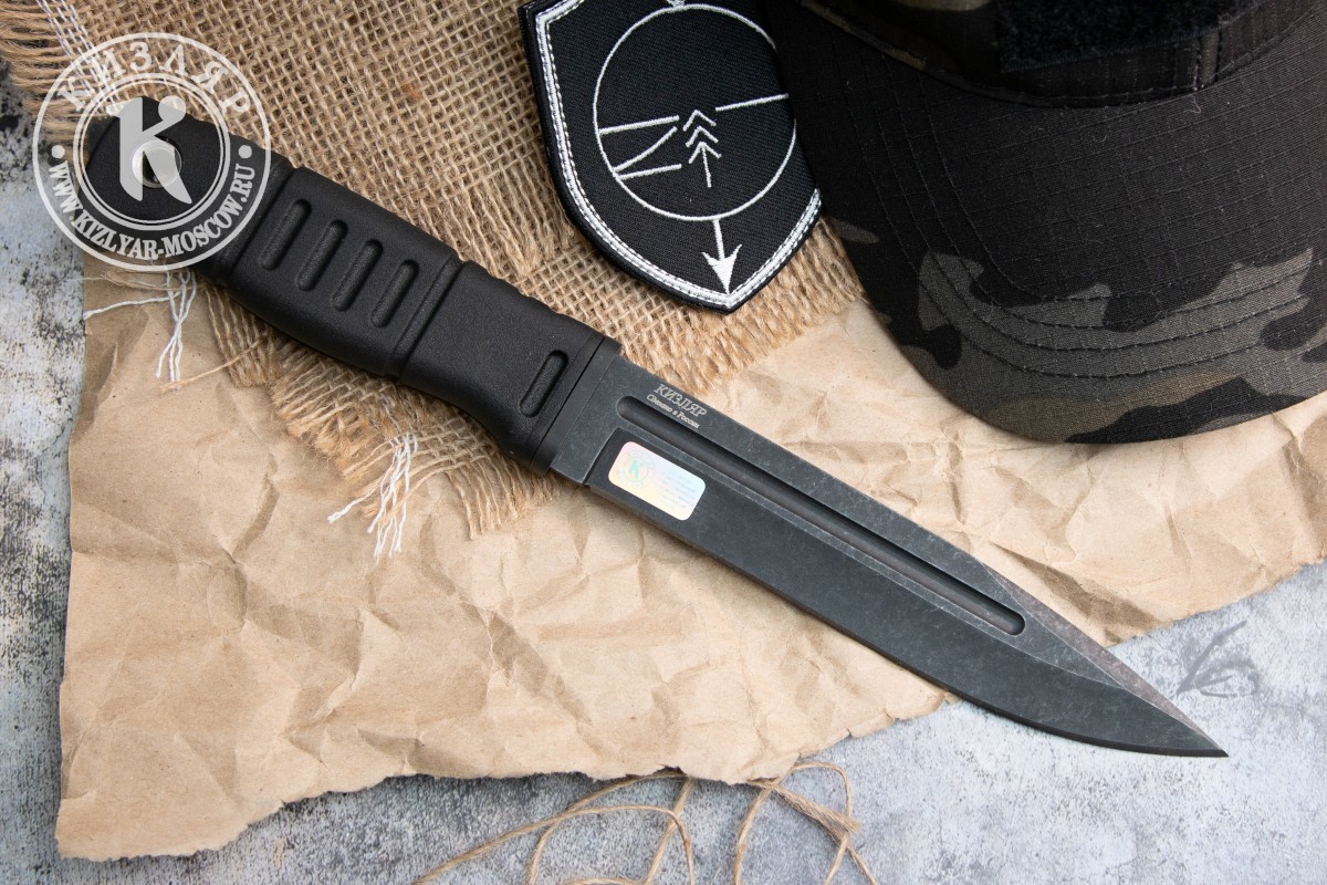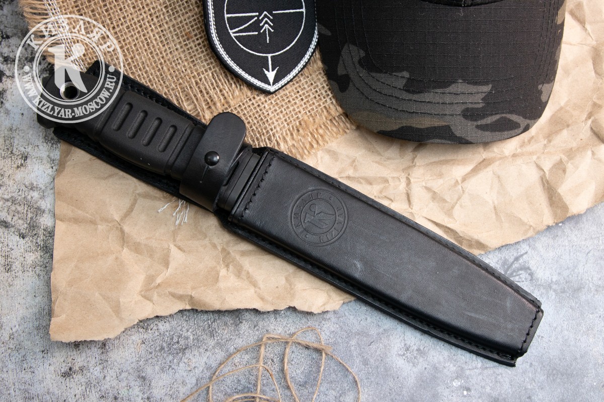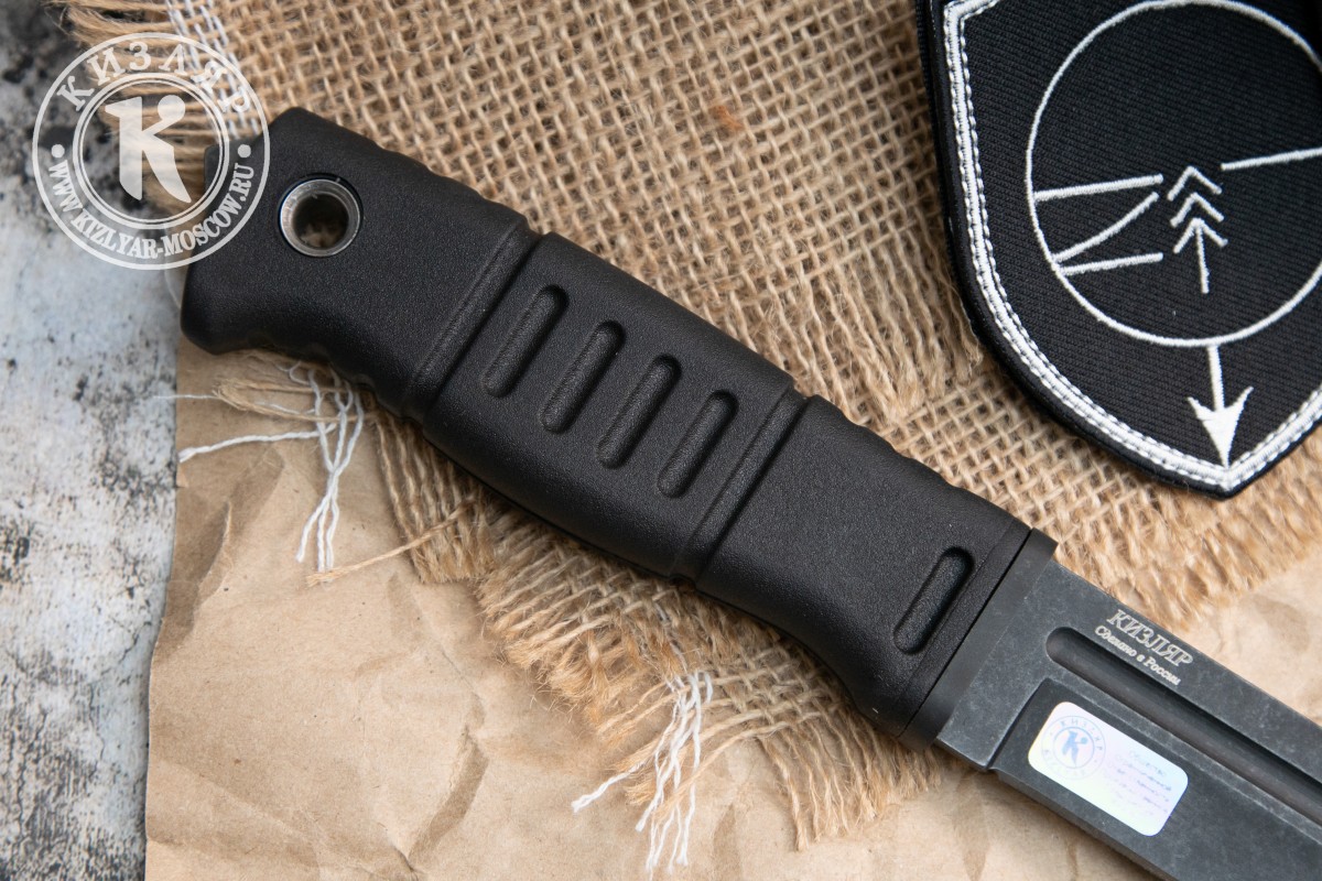 Рукоять ножа выполнена из Эластрона, который по сути является резино-пластом. Ножи из эластрона зарекомендовали себя на протяжении 20 лет, как одни из самых надежных в эксплуатации. Этот материал не боится ни мороза, ни жары, имеет прекрасные характеристики удержания в мокрой, грязной среде.